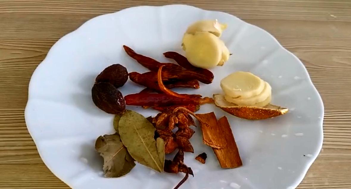 焯水的时间,我们准备一些香料:桂皮,3-4个八角,几片香叶,一块陈皮,两个草果,一小把干辣椒,姜片。