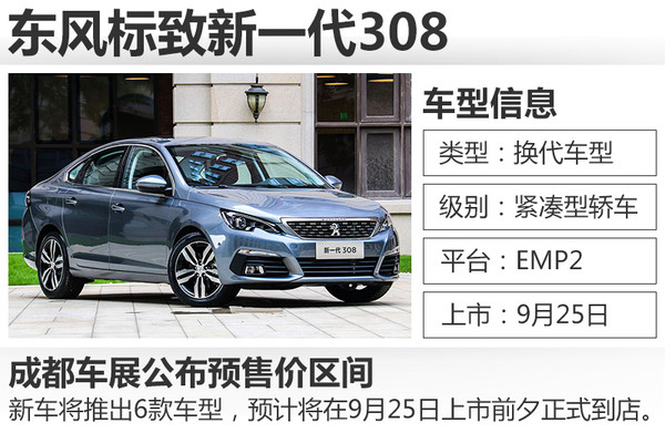 东风标致新一代308在今年北京车展期间正式首秀,新车基于EMP2平台打造,共将推出6款车型。新车将会在9月2日开幕的成都车展当天正式公布预售价格,随后在9月25日正式上市。网通社在走访多家东风标致授权经销商后了解到,新车将会在9月25日上市前夕正式到店,届时可以提前预定新车。