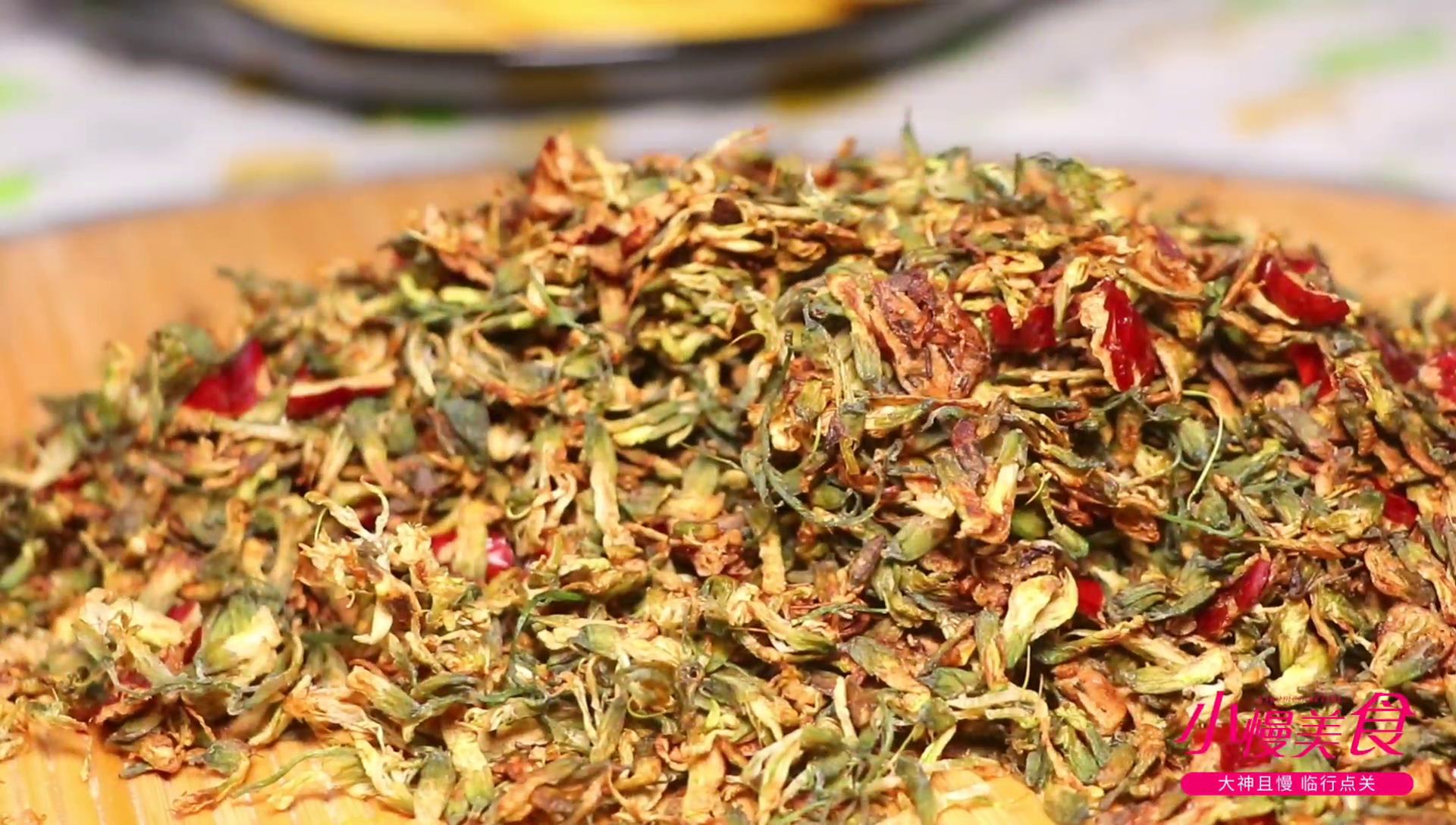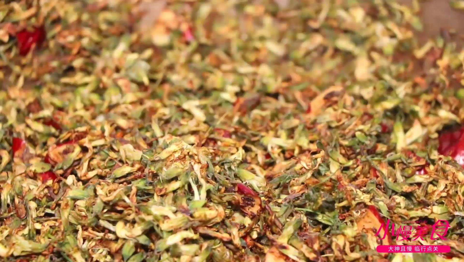 然后准备一口铁锅,将控干水分的槐花放进去转成中小火,不停的翻炒。这个过程呢时间比较长,我们要把槐花炒到一种干燥的状态,掉落下去会有一种花沙沙的声音。