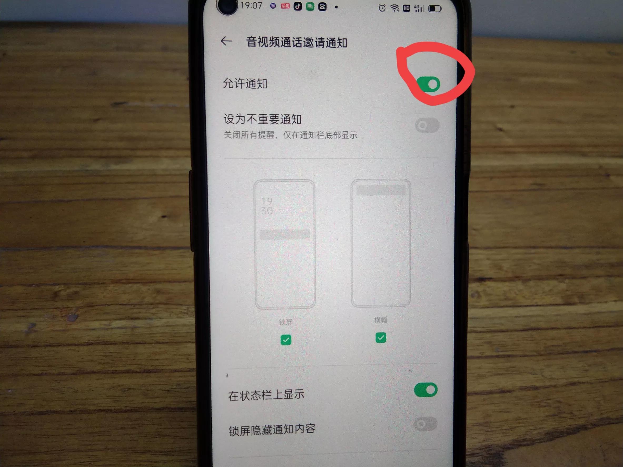 那么第3个就是这个语音和视频通话提醒,我们可以前往系统设置这个允许通知,一定要把它打开,千万不要设为不重要通知,有时候别人打电话来是处于锁屏状态的,所以这个锁屏一定要打个勾,还有横幅,那么这个邀请通知一定要让他在状态栏上显示,把这个开关打开,(如上图所示)