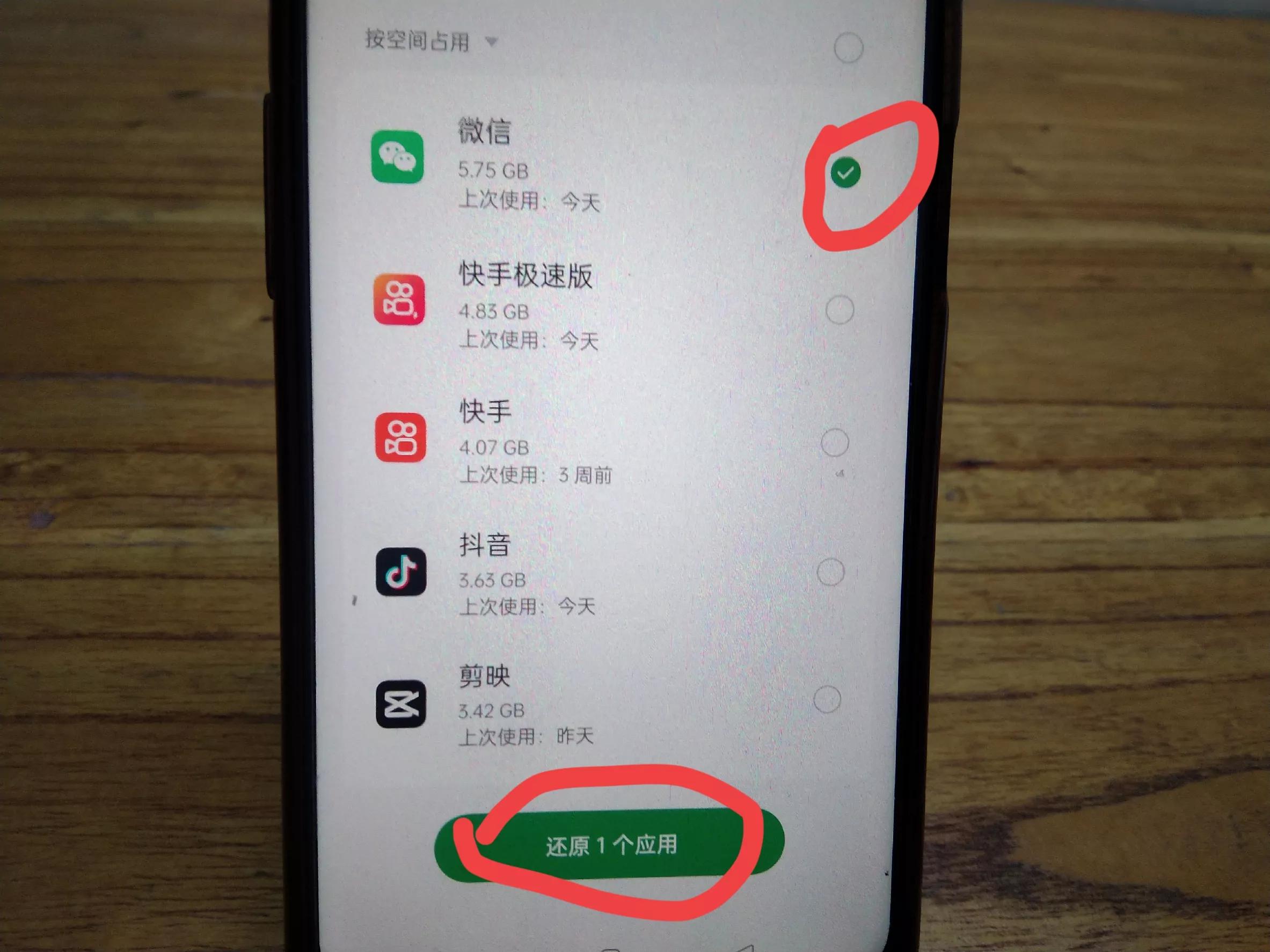 然后我们就可以看到这里有一个微信占用了很多内存,但是占用手机内存并不会影响来电情况,我们可以在这里打个勾,然后将应用还原至初始状态,删除全部应用数据且无法恢复,我们点击这里的还原,那么还原成功以后,所有的设置都恢复如初。(如上图所示)