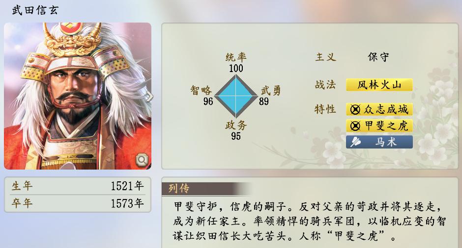 攻击力没说的,即使兵力不多,由于武田骑兵军团基本都能触发骑兵突击,此外还能增加防御最大值,不愧是战国最强骑兵军团。