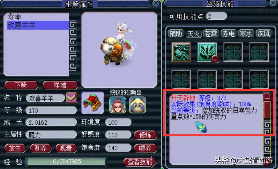 也就是说在坐骑点了“开天辟地”技能的情况下,只要你的宝宝成长能大于1.183,那么这只宝宝的力量加成实际上是要比纯伤害更高的。比如你的BB成长是1.25,那么加上开天辟地的加成,1点力量带来的总加成(面板+隐藏)就能达到1.4攻击,这难道不比纯伤害的1.33更香吗?况且现在谁还用成长低于1.183的宝宝做攻宠?