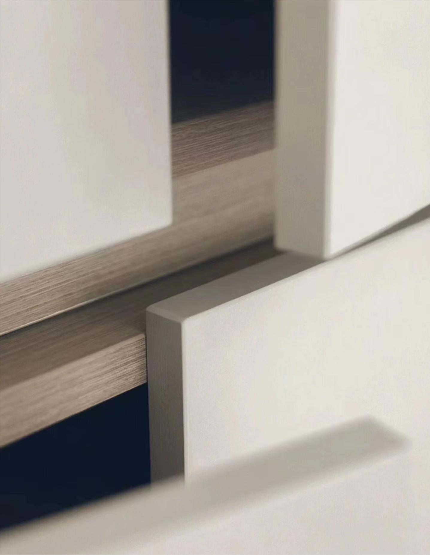 我们看到满足黄金比例的分割柜门布局看起来十分协调,颜值一点不比一门到顶柜门差,还解决了一门到顶柜门成本高易变形的问题,绝对的性价比之选。