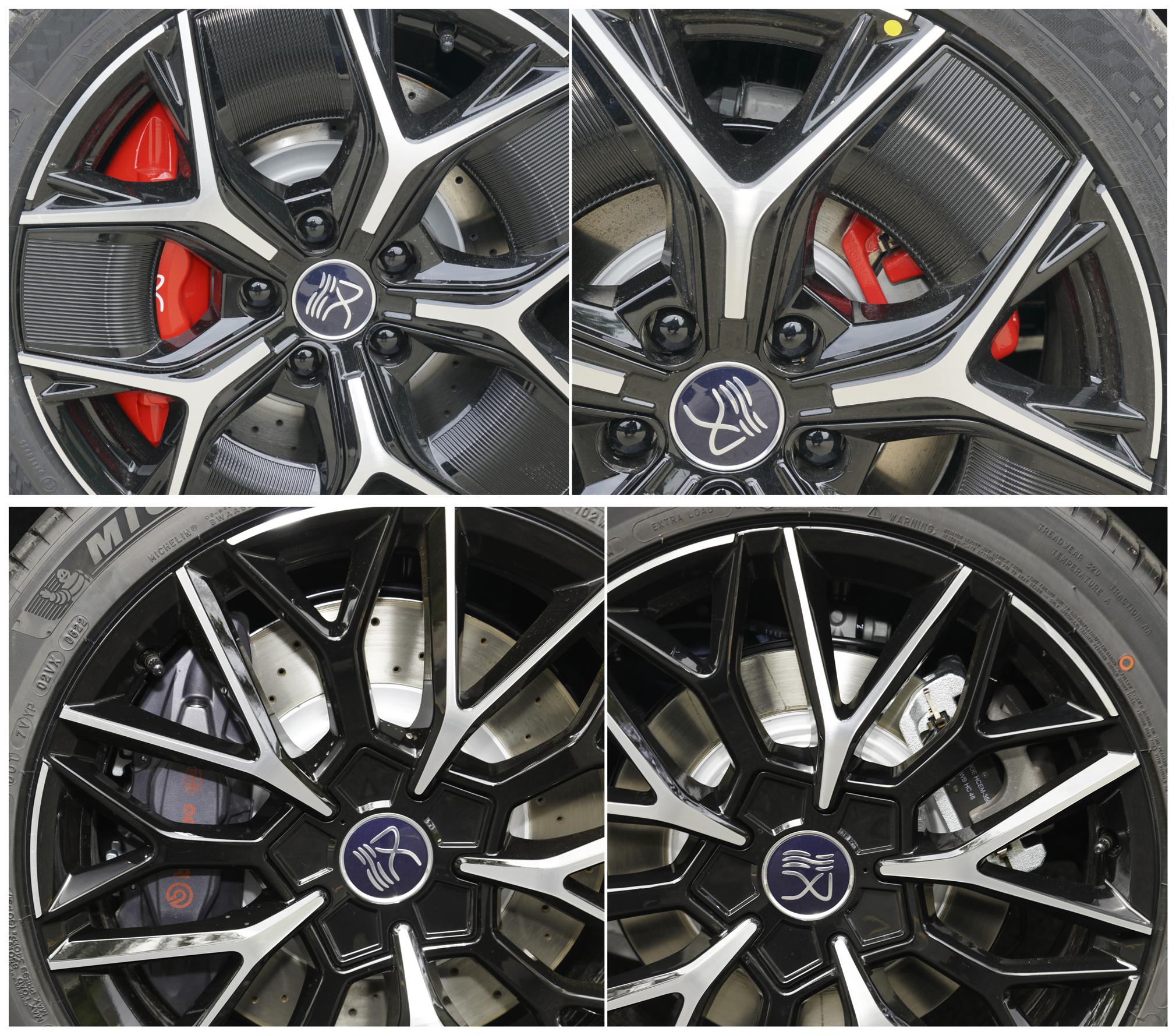 22款 610KM四驱千山翠限量版的前刹车盘使用通风盘式打孔刹车盘+高性能石绿四活塞刹车卡钳,后刹车盘使用实心盘式刹车盘+石绿色单活塞刹车卡钳;