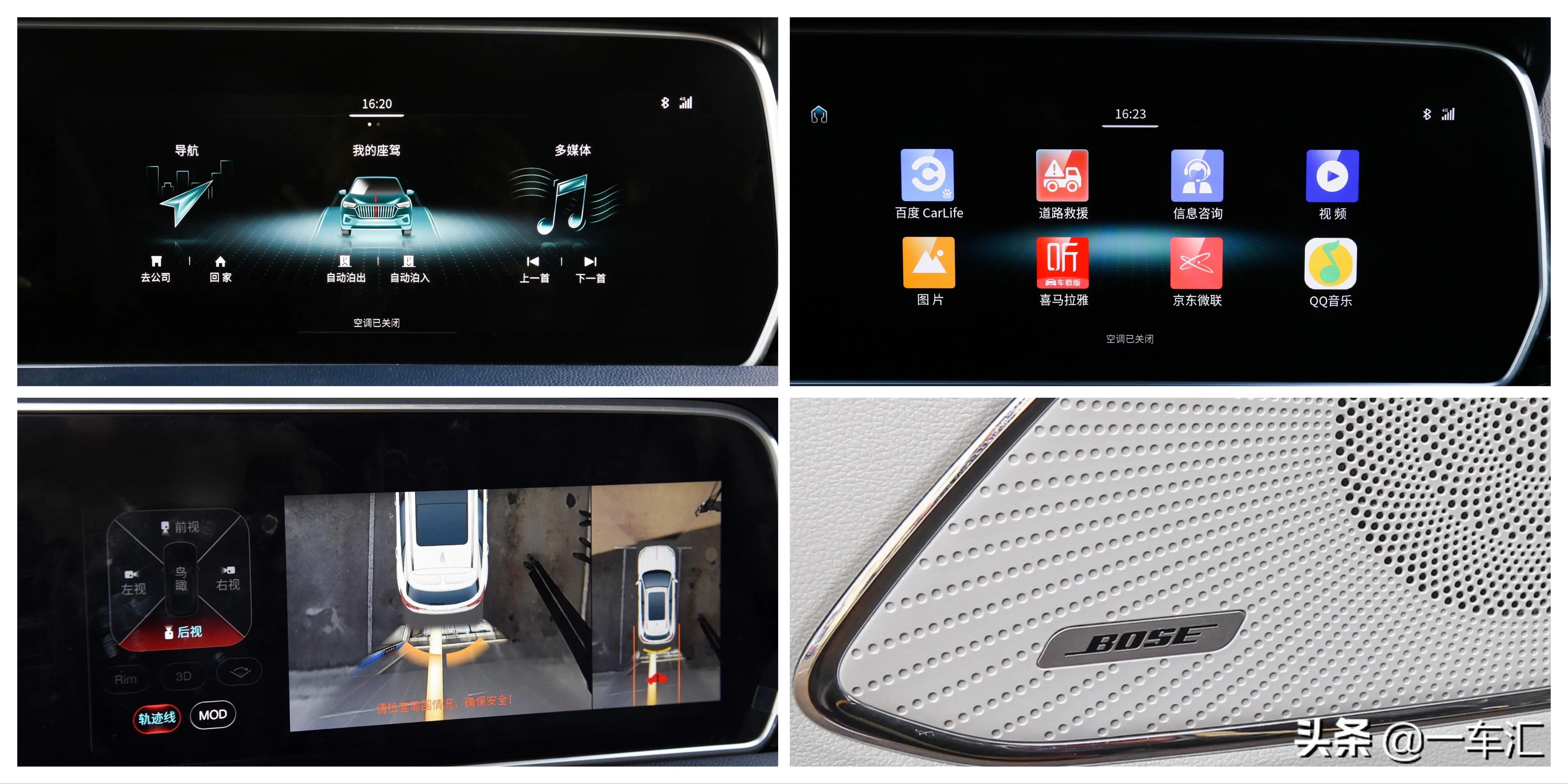 车尾部分同样十分饱满圆润,车顶扰流板在后风挡周围呈环绕样式,中间集成高位刹车灯带;尾门中间的红旗汉字车标,看起来相当有情怀感。尾灯造型与车尾表面轮廓贴合紧密,中间增加了一段镀铬饰条连接,搭配底部包围处的镀铬饰条,提升了尾部的层次感。车尾底部双边共两出排气尾喉,提升气势之余不乏内敛;全系标配了前后驻车雷达和倒车影像,除最低配智联旗悦版外,其它版本车型均升级为360度全景影像,且配备了倒车车侧预警系统。