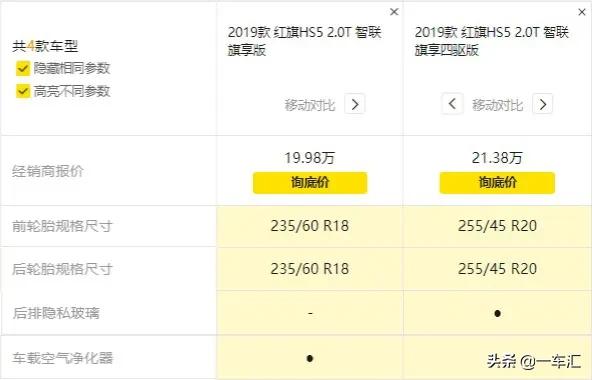 下面针对2019款红旗HS5全系不同版本之间配置差异,进行详细对比解读。