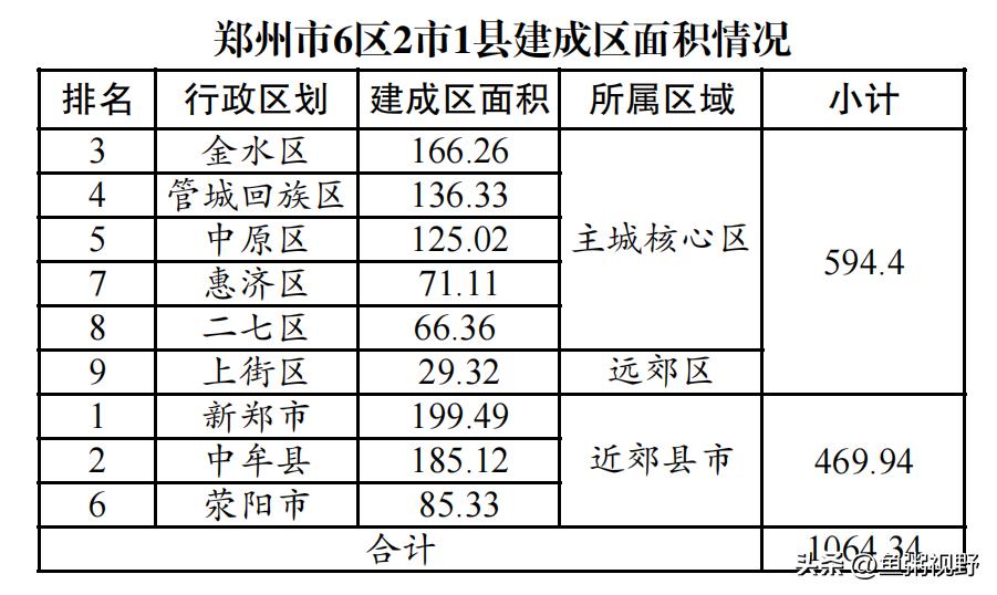 综上,郑州市6区的建成区面积为:594.4平方公里。如加上融城的新郑、荥阳2市、中牟县,整个城市圈面积突破1000平方公里,达到惊人的1064.34平方公里。从行政区划数量来看,郑州市市辖区相对同级别城市偏少,使得其建成区面积“偏小”。从行政区划规模来看,新郑市即将突破200平方公里,上街区不到30平方公里,二者相差近6倍,中牟、金水、管城、中原均突破100平方公里。