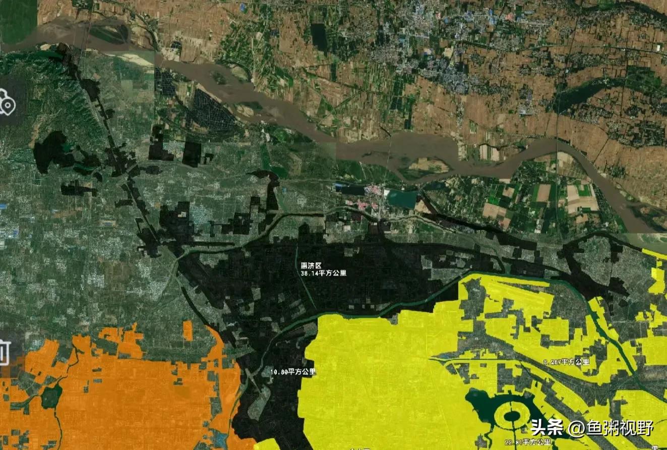 惠济区,位于郑州市区北部,毗邻黄河,幅员面积232平方公里,人口56万,2023年GDP为324亿元。笔者测得其建成区面积为:71.11平方公里。