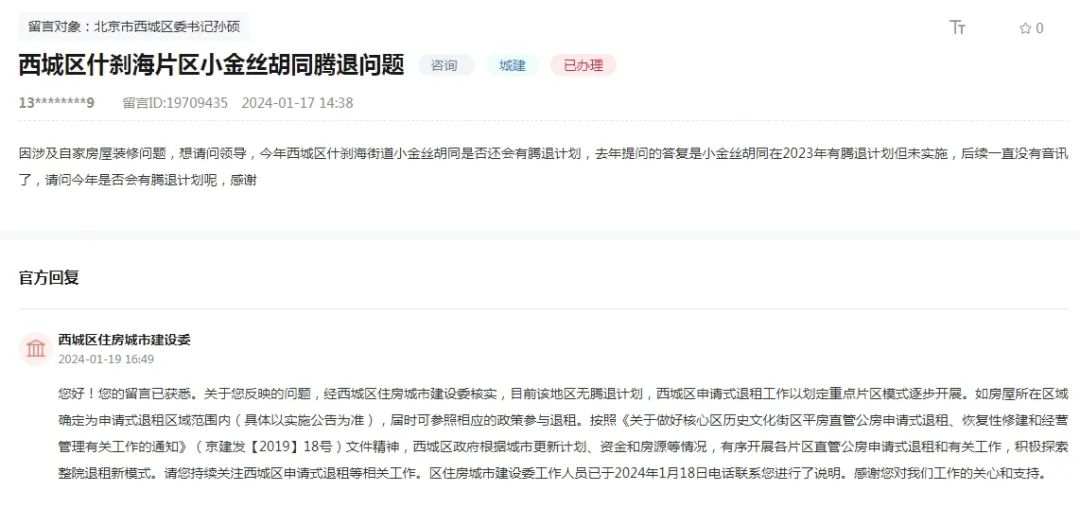 因涉及自家房屋装修问题,想请问领导,今年西城区什刹海街道小金丝胡同是否还会有腾退计划,去年提问的答复是小金丝胡同在2023年有腾退计划但未实施,后续一直没有音讯了,请问今年是否会有腾退计划呢,感谢