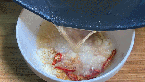 6. 将滚烫的热油浇在上面激出香味,用勺子搅匀,加入食盐
