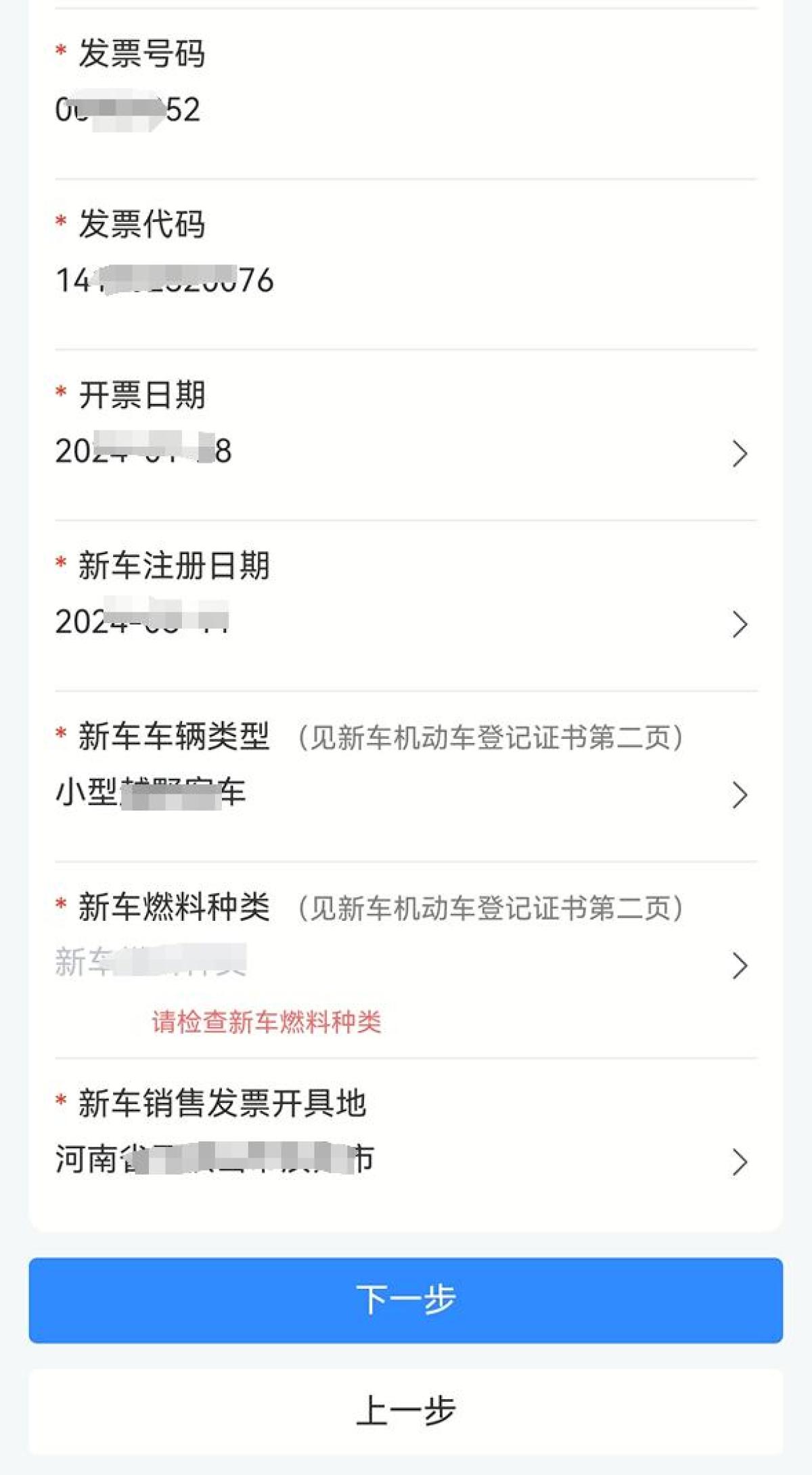 上传完新车证件后,请核对系统识别字段是否正确,如识别错误请重新填写。