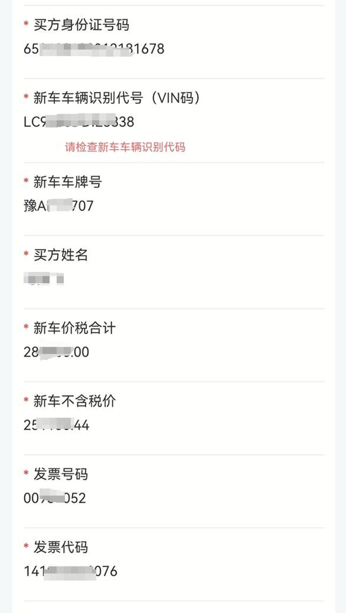 1.请核验系统识别买方姓名、买方身份证号码、新车车辆识别代码、新车车牌号、新车注册日期、新车销售金额是否正确,如识别错误,请修改。