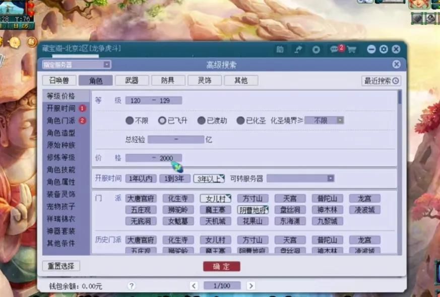 首先我们打开格子点高级搜索等级,选择120至129等级门派,这里我们只需要选择地府与女儿村。有人会问,为什么不选择无底洞呢?原因很简单,无底洞太多了且便宜,最后我们再考虑它。