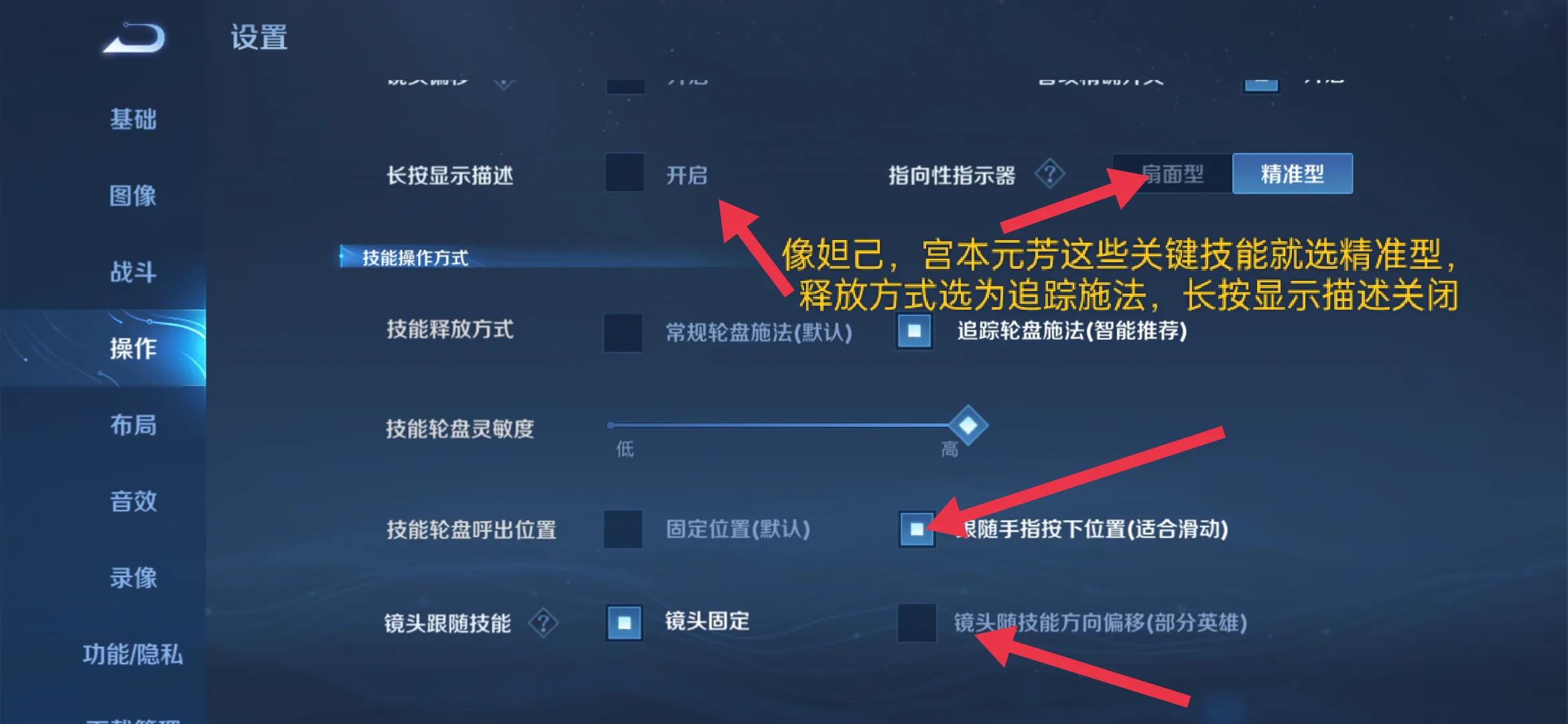 长按技能描述和技能释放方式是联动的,当我们选了第二种追踪轮盘施法就要把长按显示描述关闭,不然就会很难受,