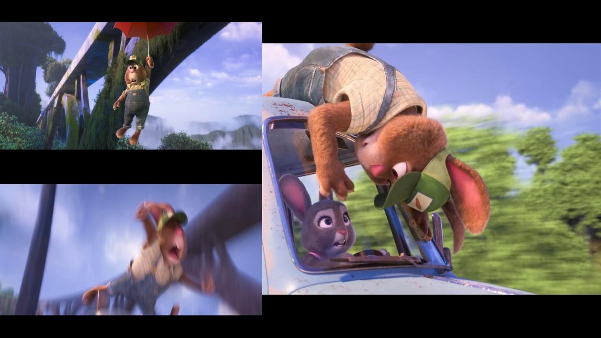 途径一座大桥时兔爸从列车上被甩了下来,幸好兔妈及时赶到接住兔爸