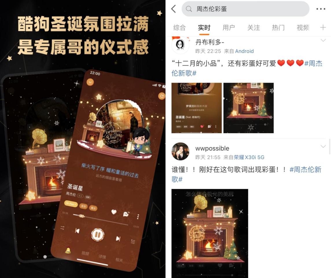 除第一时间上线新歌和MV外,在酷狗所有活动中,最吸睛的当属新歌主题播放器和播放彩蛋。酷狗为新歌《圣诞星》定制了专属播放器。专属播放器和播放页彩蛋,画面整体使用暖色调,漫天飘舞的雪花,燃烧着温暖柴火的壁炉,闪烁的点点星光,拉满了圣诞氛围感,在这个持续降温的冬日里,带来视觉和听觉上的温暖,为歌迷打造沉浸式听歌体验;彩蛋功能也加码了圣诞惊喜,引发网友刷屏使用。