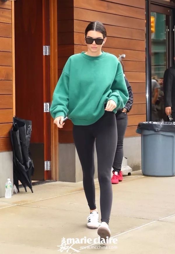偏爱简约休闲风的欧美明星们也最擅长把卫衣穿出休闲感。大长腿Kendall Jenner戴金色Hoop耳环和黑色墨镜,身穿孔雀绿卫衣,下穿黑色紧身Legging,脚踩Adidas白色球鞋,一身运动休闲的同时还不忘秀了一把美腿,气场简直不要太强。