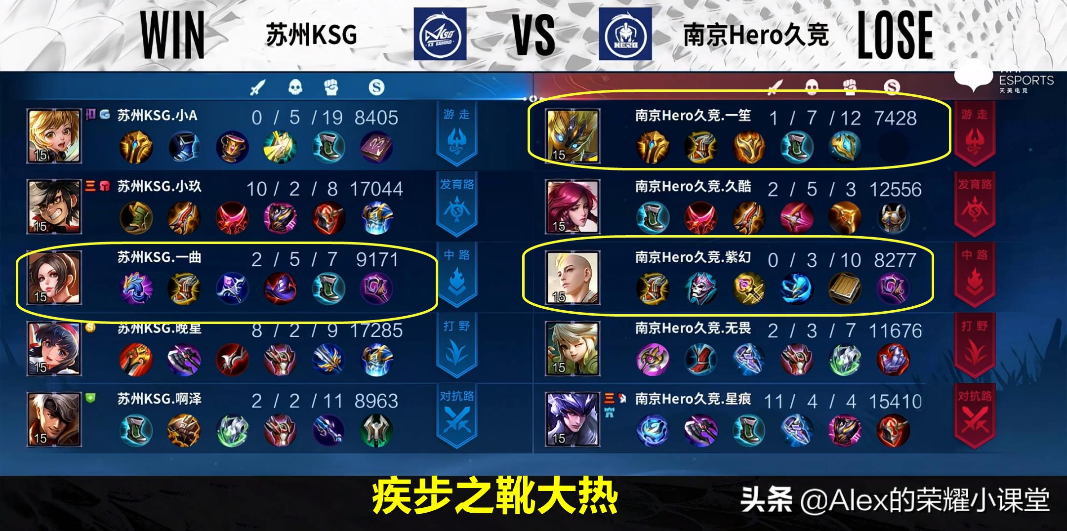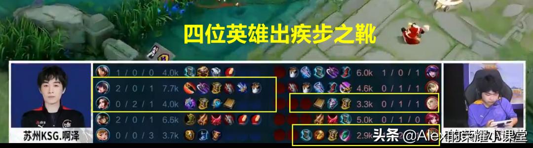 所以疾步之靴就开始在KPL职业赛场“内卷”了,比如南京Hero久竞对阵苏州KSG的比赛。