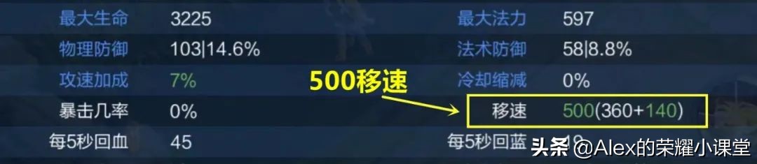 张良购买疾步之靴,脱战后360+80+60=500点移速,和面板属性一致。