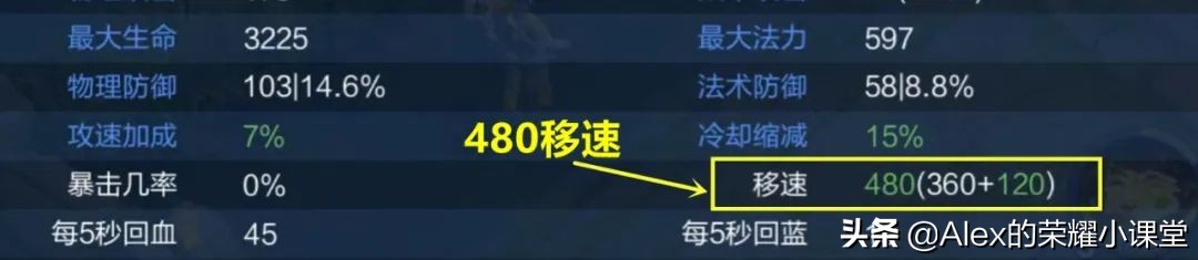 以张良为例,基础移速为360点,疾步之靴80移速+脱战60移速。