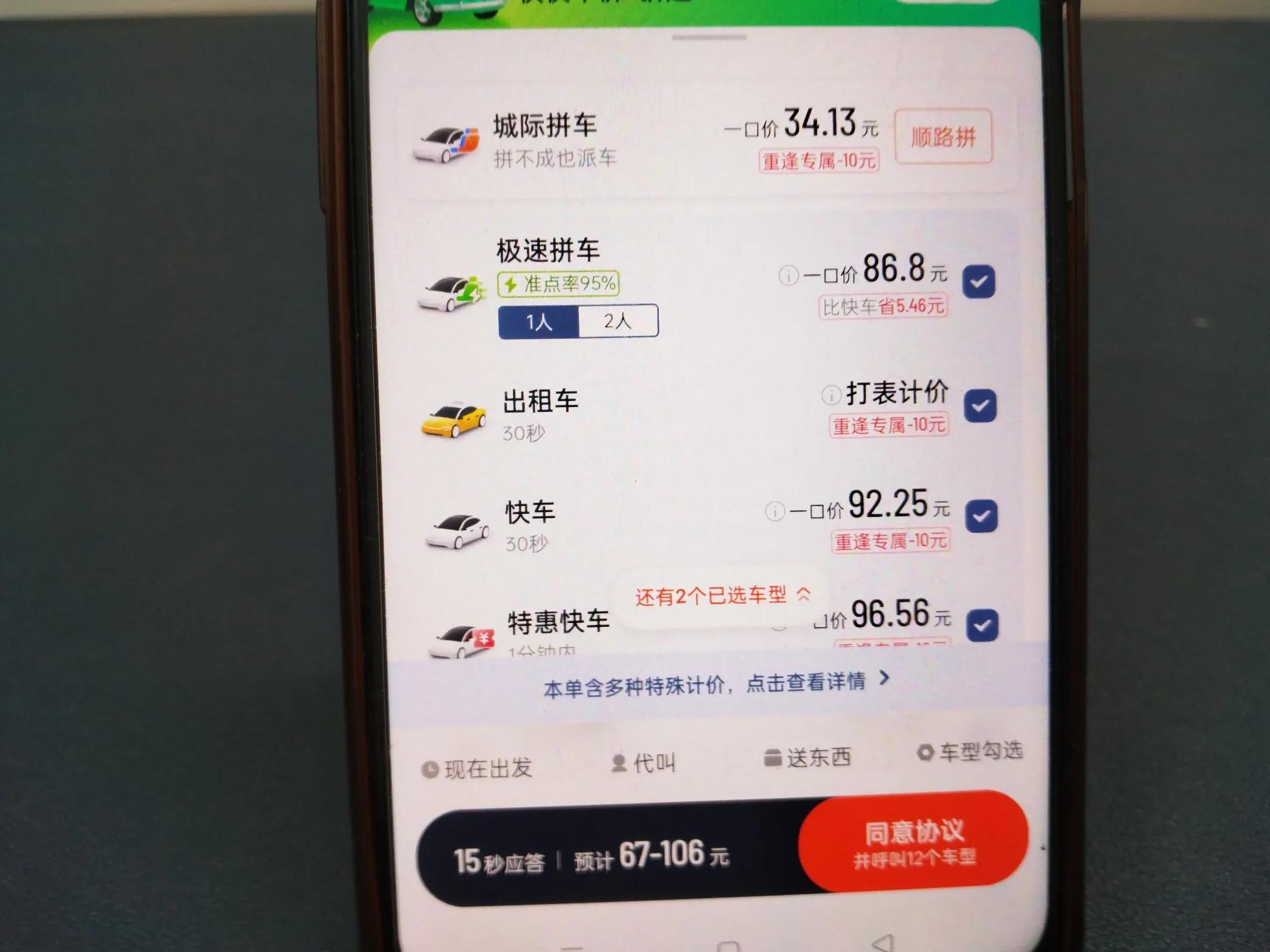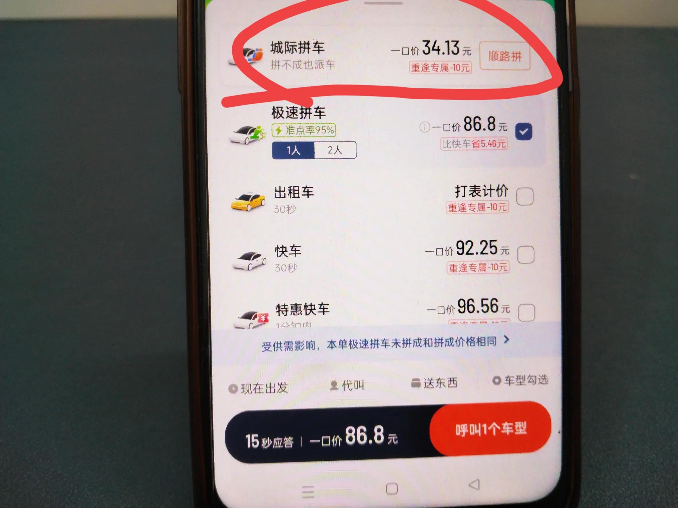 进入选择车型页面。如果我们不赶时间,想打便宜的车,可以选择城际拼车,因其价格较低,但可能速度较慢。(如上图所示)