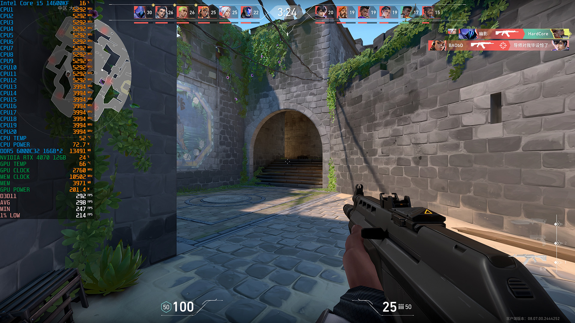 14600KF(降压版)+影驰RTX 4070 20周年纪念版运行《无畏契约》4K分辨率手动最高画质平均帧数为298fps