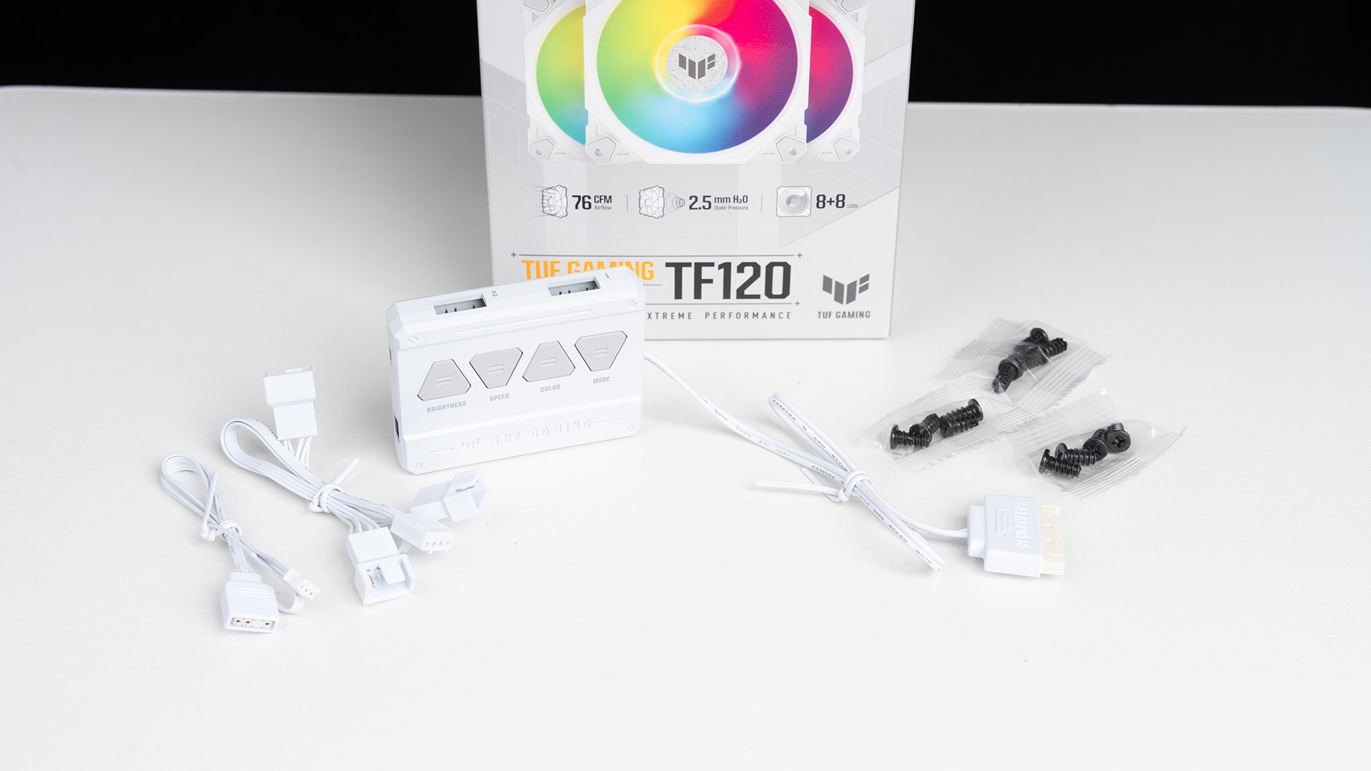 TUF GAMING TF120侠光ARGB采用了流体动力轴承,在高装时相比常见FDB轴承噪声更低,它也是一款偏风量设计的产品——提供高达76CFM风量,视觉效果方面支持双层LED列阵,可配合控制器玩出不同的花样。