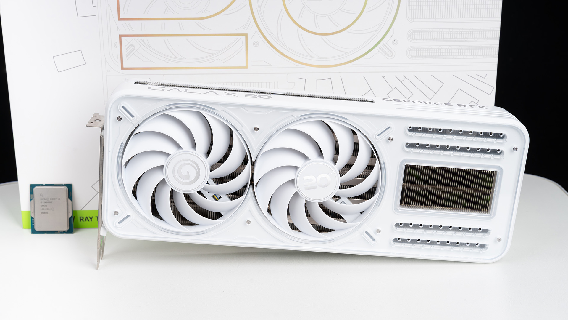显卡选用了来自影驰的RTX 4070 20周年纪念版,搭配14600KF正合适,显卡外观采用了家族式的纯白设计,采用工艺精良且繁多,包括CNC、金属拉丝、金属压铸等,使整体质感会有较大的提升。正面和主流非公显卡不太一样,在两枚100mm正叶风扇旁边是一个可拆卸亚克力盖板+鳍片裸露的区域。