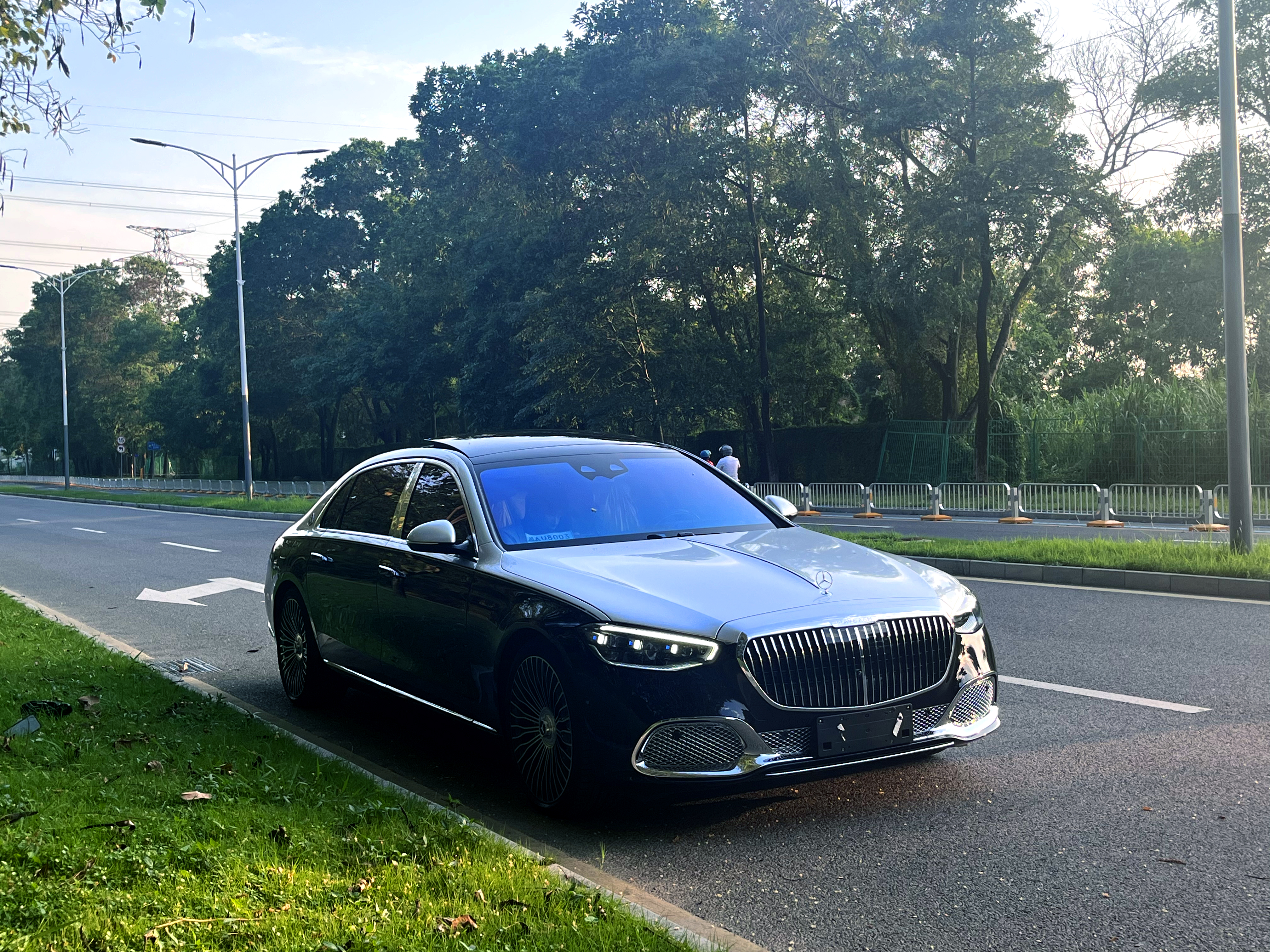 现在大家看到的这台车,是2024款的迈巴赫S480,我们已经给外观改装双拼色、21寸香槟杯轮毂、前杠格栅、流星雨大灯,玻璃也换成了夹层玻璃,前后挡风玻璃泛着蓝光,显得非常高端。所以外观看上去和迈巴赫S680是一样的了。