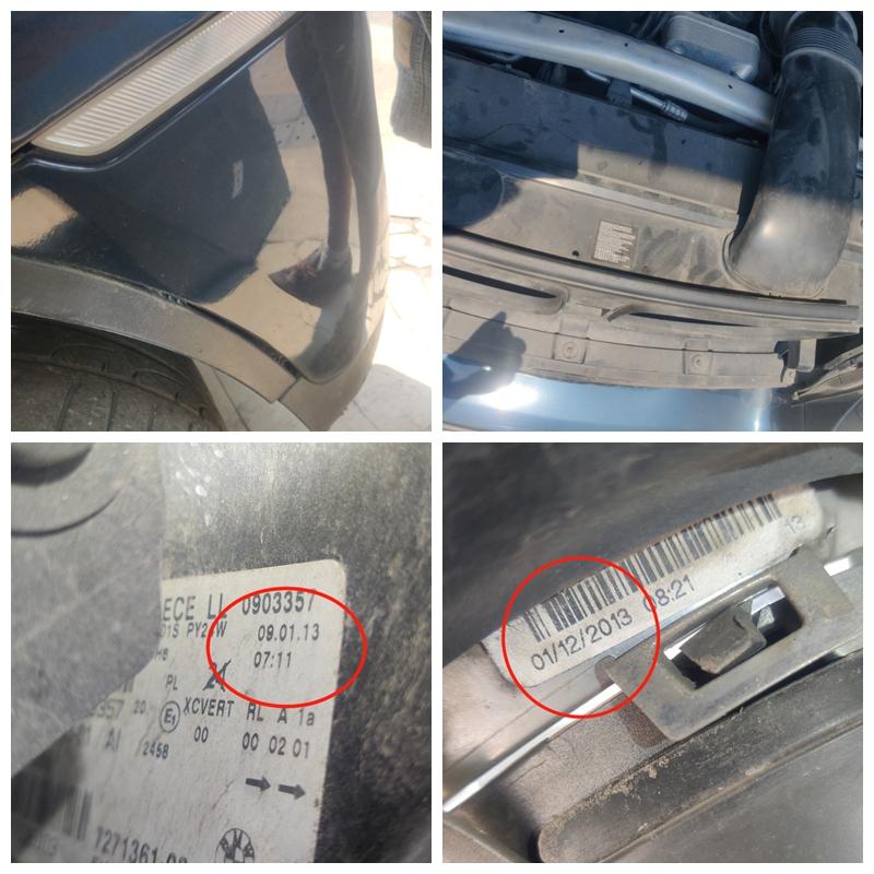 还是老规矩,我们先从车头看起。前保险杠有拆卸更换过,水箱框架有拆卸,但是两边的大灯和中网都是原装的,日期都对得上,证明前面没有太大的问题,因为如果前方撞过的话,大灯和中网不可能没问题。现在前保险杠这些更换可能是喷漆剐蹭,水箱框架拆卸可能是修什么东西。