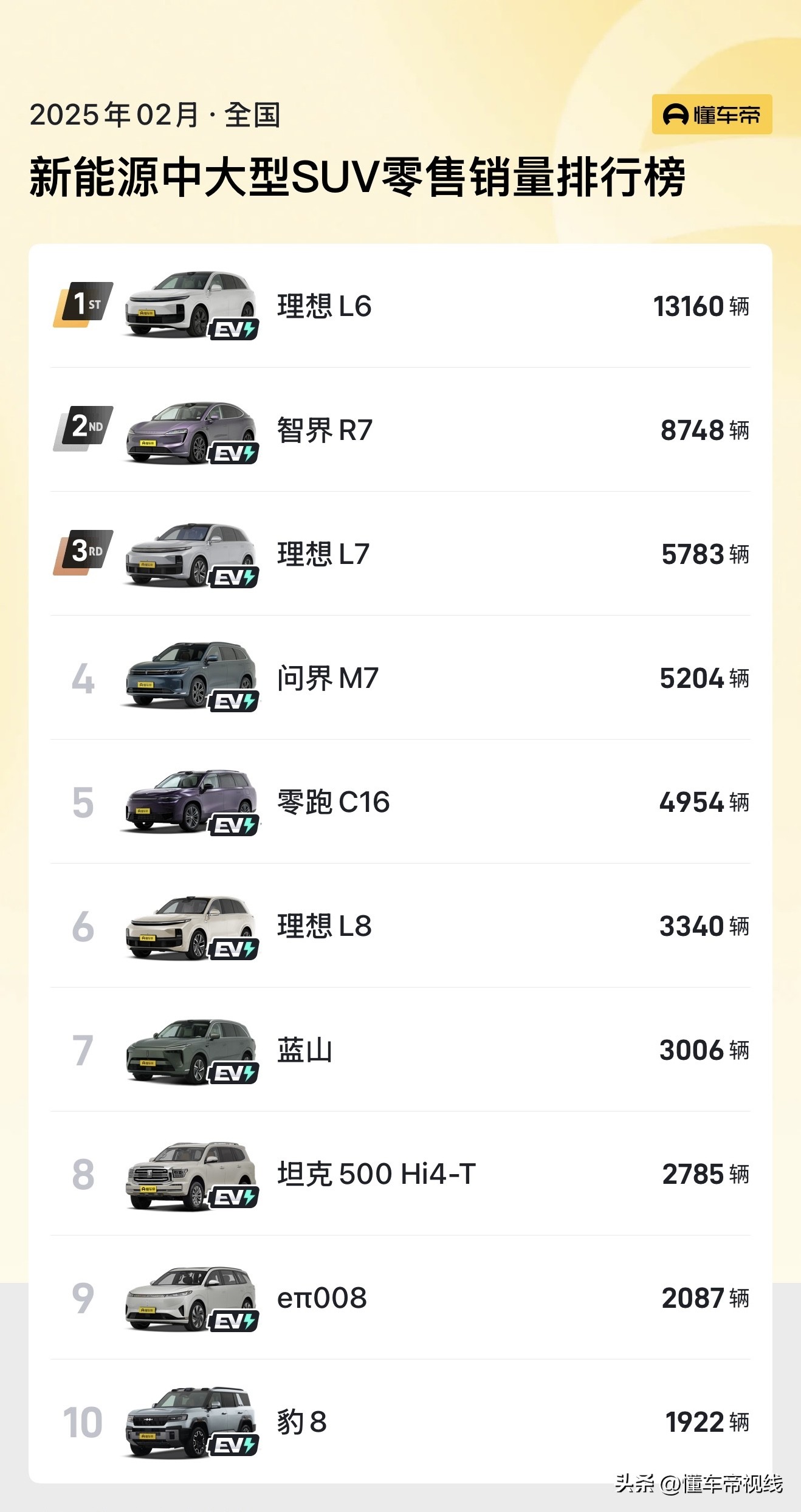 昊铂HL定位于新能源中大型SUV,结合车型级别以及预售价来看,该车潜在竞争对手或指向理想L8(指导价32.18万-37.98万元)、问界M8(预售价36.8万-45.8万元)等车型。根据懂车帝销量数据,今年2月,新能源中大型SUV市场销量较好的车型有理想L6(13160辆)、智界R7(8748辆)等。更多消息,懂车帝将持续关注。