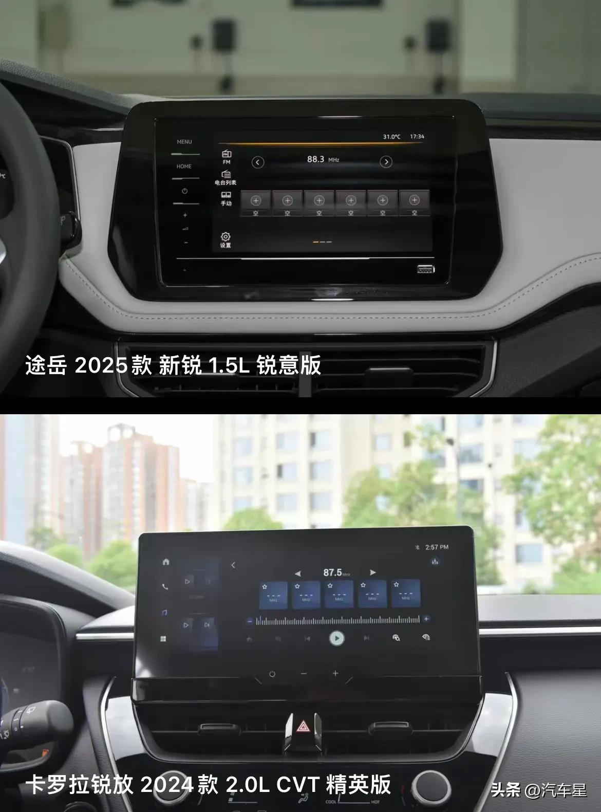 上汽大众途岳新锐搭载了8英寸的全液晶仪表盘和8英寸的中控屏幕,卡罗拉锐放搭配了7英寸的全液晶仪表盘和10.25英寸的中控屏幕,在功能方面,两款车都有蓝牙车载电话、手机互联映射功能,其中的卡罗拉锐放多了OTA升级和道路救援服务,并且两款车都有4个扬声器。