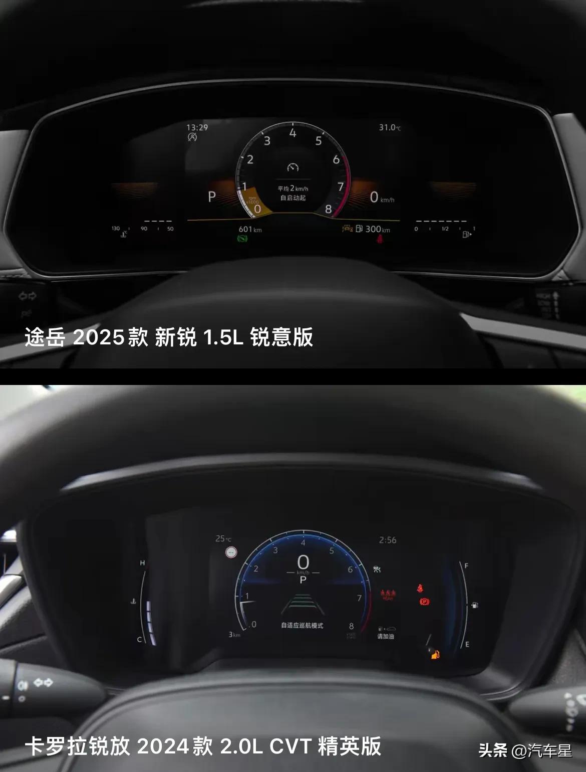 我们选择上汽大众途岳新锐其中的2025款 新锐1.5L 锐意版(指导价13.59万)和卡罗拉锐放其中的2024款 2.0L CVT精英版(指导价13.98万),将两车进行对比,从设计部分、车机功能/安全配置、空间部分、动力组合等角度,看看表现怎么样?