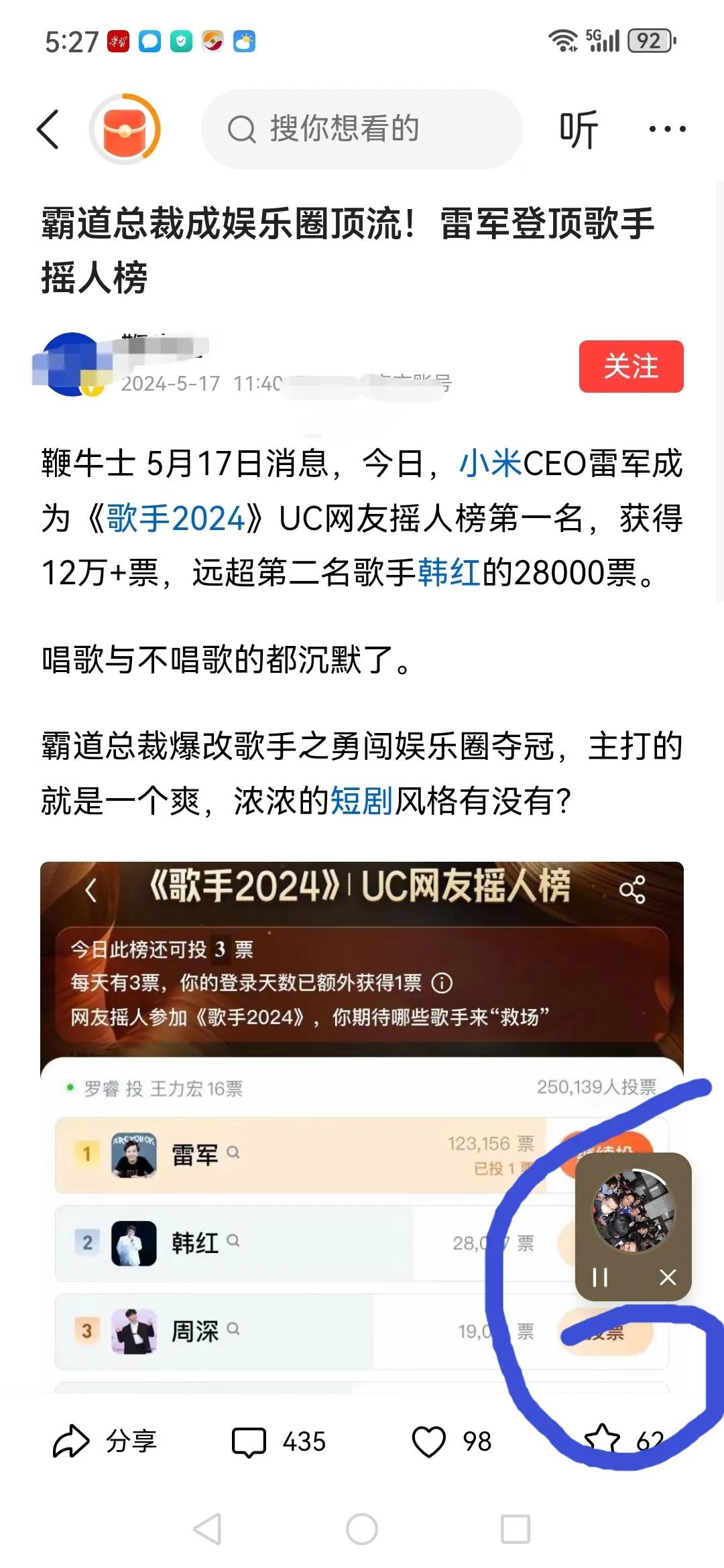 6.神奇的一幕出现了,我读到了文章《雷军登……》,耳朵却仍旧听到《台立法……》(缩小在右下角)。就是说,有时候,听播报丶读文章,两不耽误: