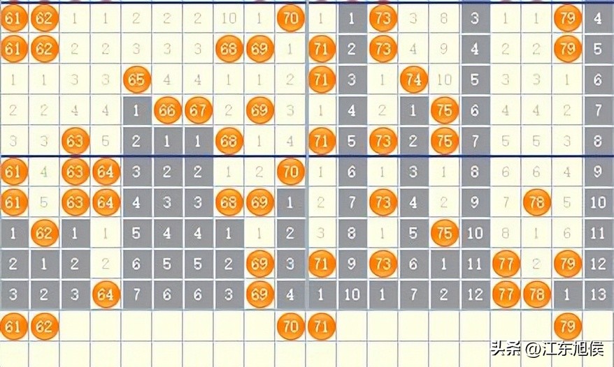 61-80区间分析:本区间出现了65+66+67的长冷地带,以及76这个冷号超12期的遗漏,80超13期的遗漏,80可重点关注。下移号码可关注78+69+64,三选一。相邻号码可看63.65.68.70,其中70可重点关注,70的热门组合包括5.54.45.27.32.1等;属于远期的大热门号码,最近注意观察。