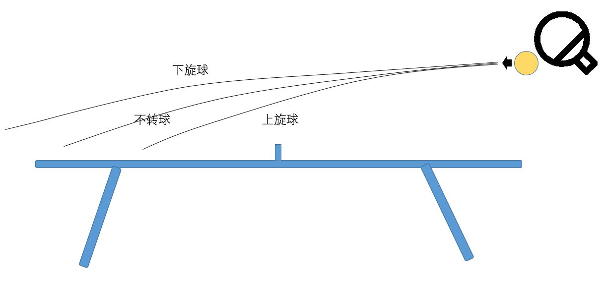而下旋球便于刚才我们所讲的过程相反,因此会产生一个向上的压力抵消掉一部分重力,因此,运动轨迹会比不旋转时更高一些。乒乓球不但有上旋下旋,还有左旋右旋,左旋右旋着会导致乒乓球在竖直方向上的运动不会在一个平面上,因为伯努利原理会导致乒乓球会在空中左拐或者右拐。