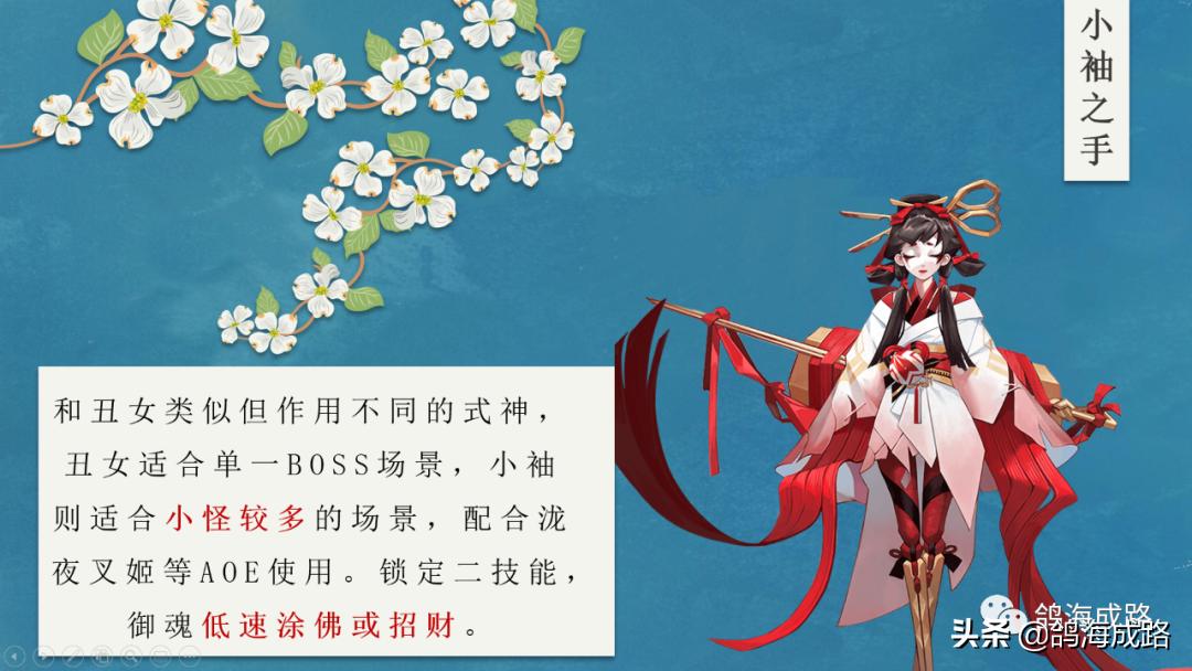 小袖之手:和丑女类似但作用不同的式神,丑女适合单一BOSS场景,小袖则适合小怪较多的场景,配合泷夜叉姬等AOE使用。锁定二技能,御魂低速涂佛或招财。