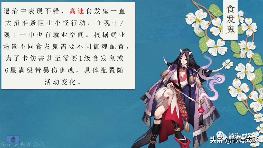 食发鬼:退治中表现不错,高速食发鬼一直大招推条阻止小怪行动,在魂十/魂十一中也有就业空间。根据就业场景不同食发鬼需要不同御魂配置,为了卡伤害甚至需要1级食发鬼或6星满级带暴伤御魂,具体配置随活动变化。