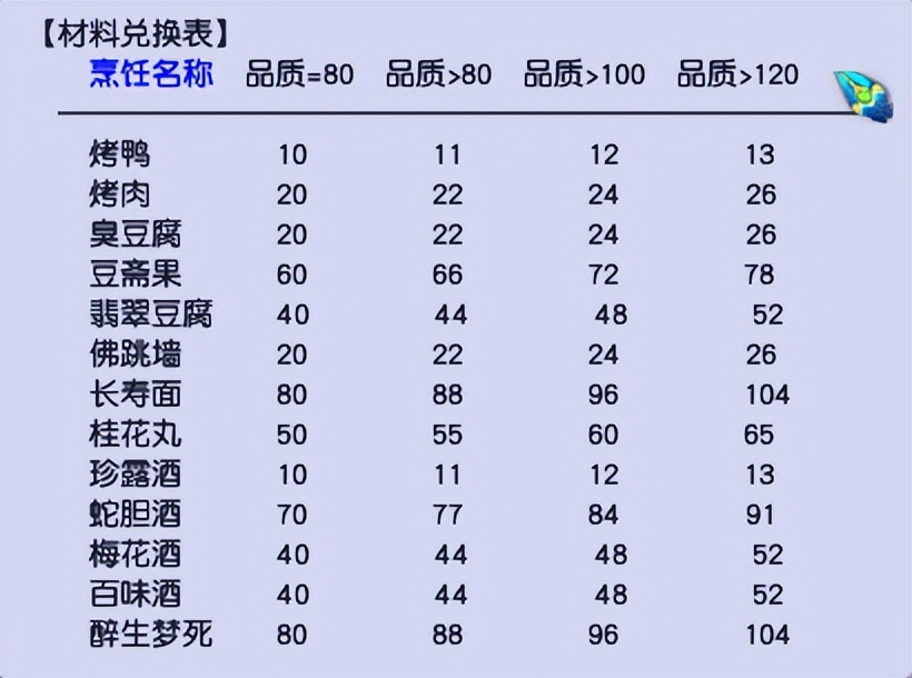 这张表对寿命类烹饪的价格也有影响,桂花丸低于1.3W不要卖、长寿面低于2.1W不要卖。