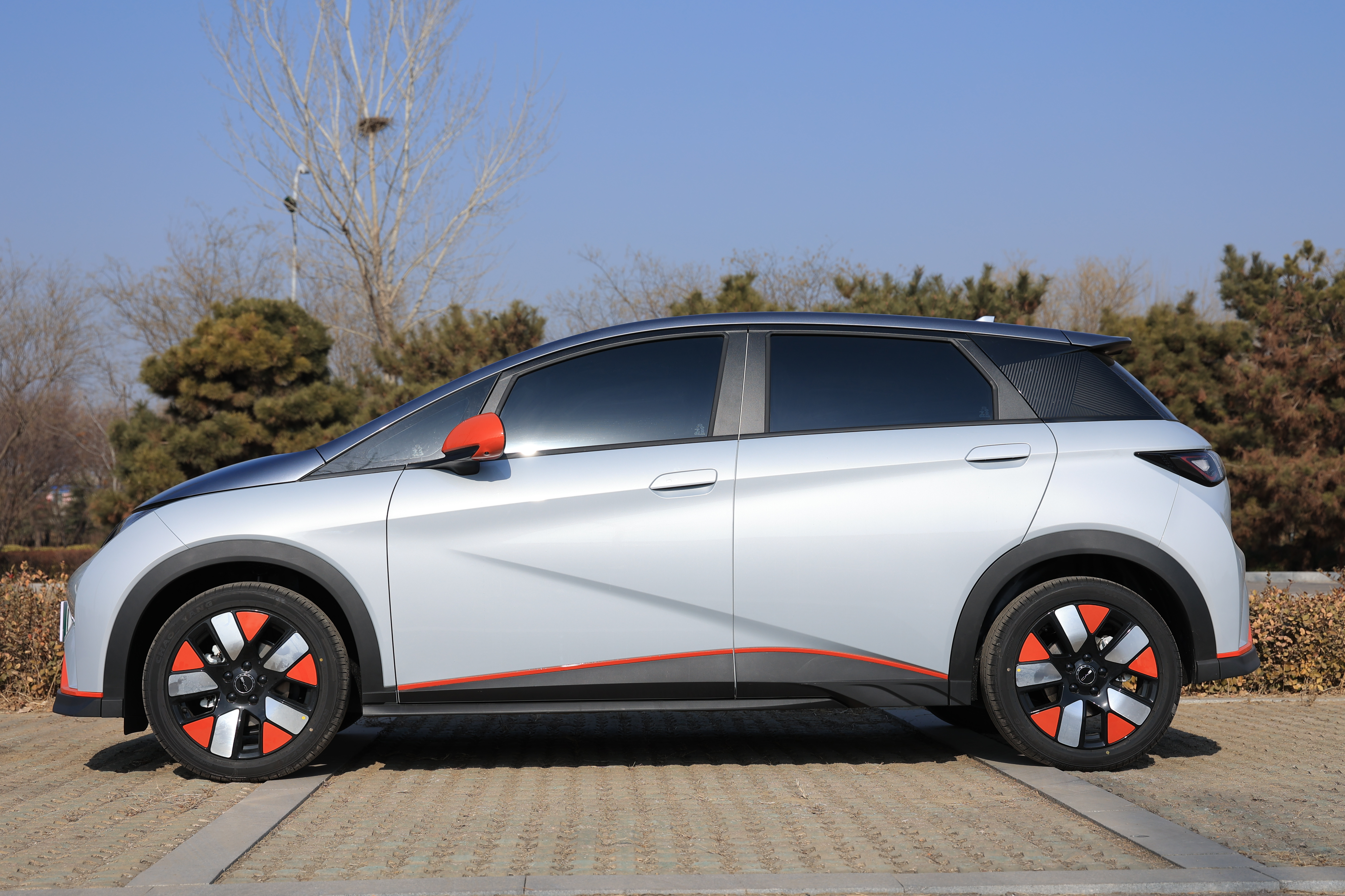 来到车身侧面,海豚的腰线设计风格不同于前脸,侧面线条则是更显凌厉,上翘的腰线,还有门板上斜向的线条,都让它多了一份运动感。