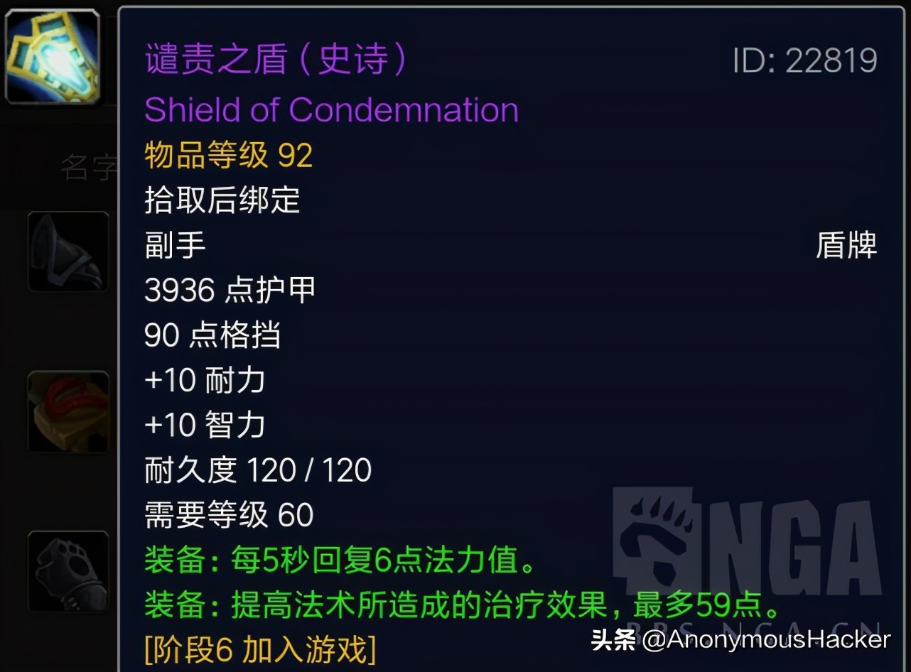 谴责之盾在治疗属性上甚至直接超越了萨菲隆右眼,没有理由不拿盾,盾牌还可以附7耐而副手不可以附魔,送的4000护甲也非常非常重要。