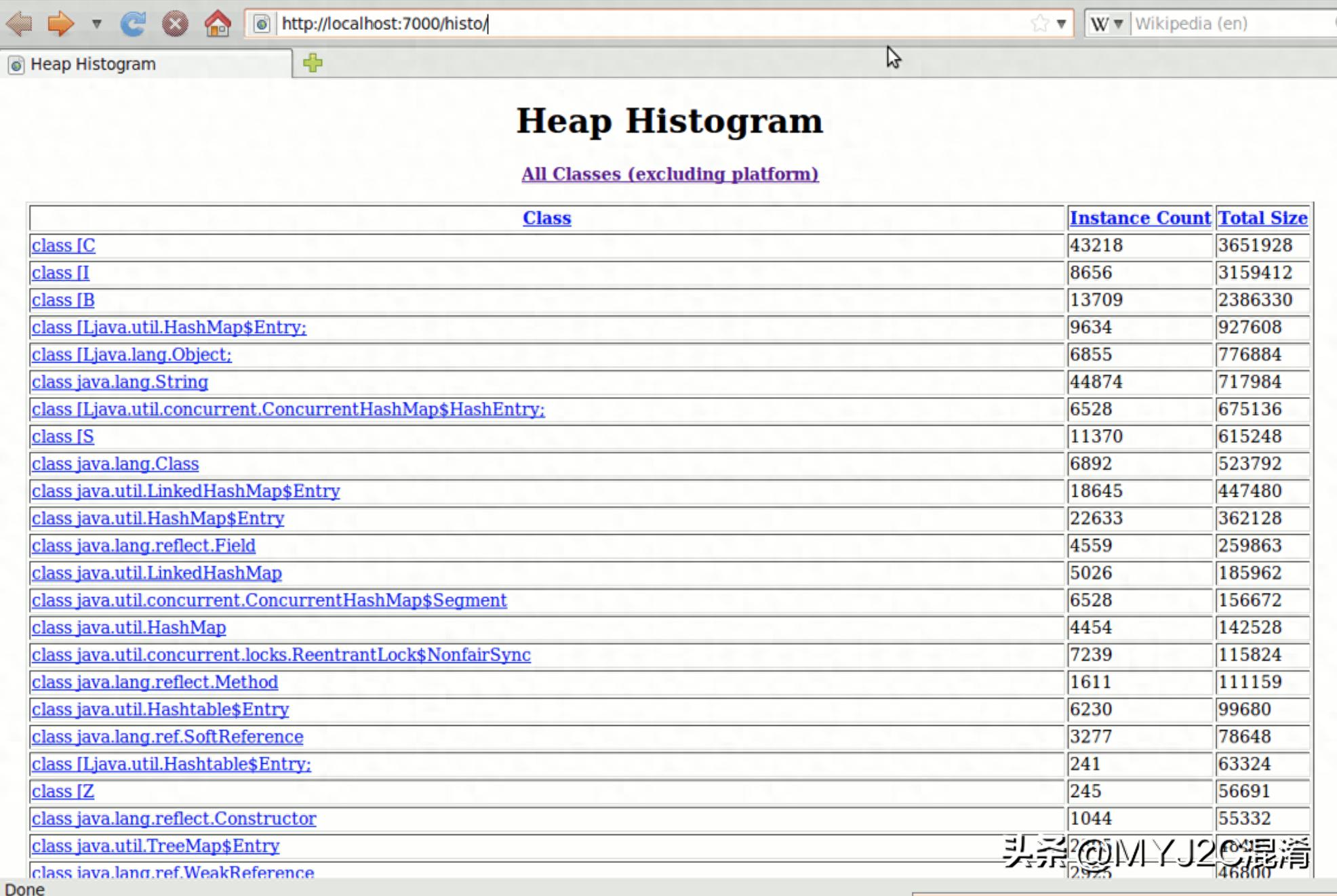 Server is ready.默认的URL为您提供了系统中加载的所有类的列表,我很少发现这些类有用。相反,我从http://localhost:7000/histo/,这是一个直方图视图,可按实例计数或总字节进行排序(单击右侧的图像可查看完整版本)。