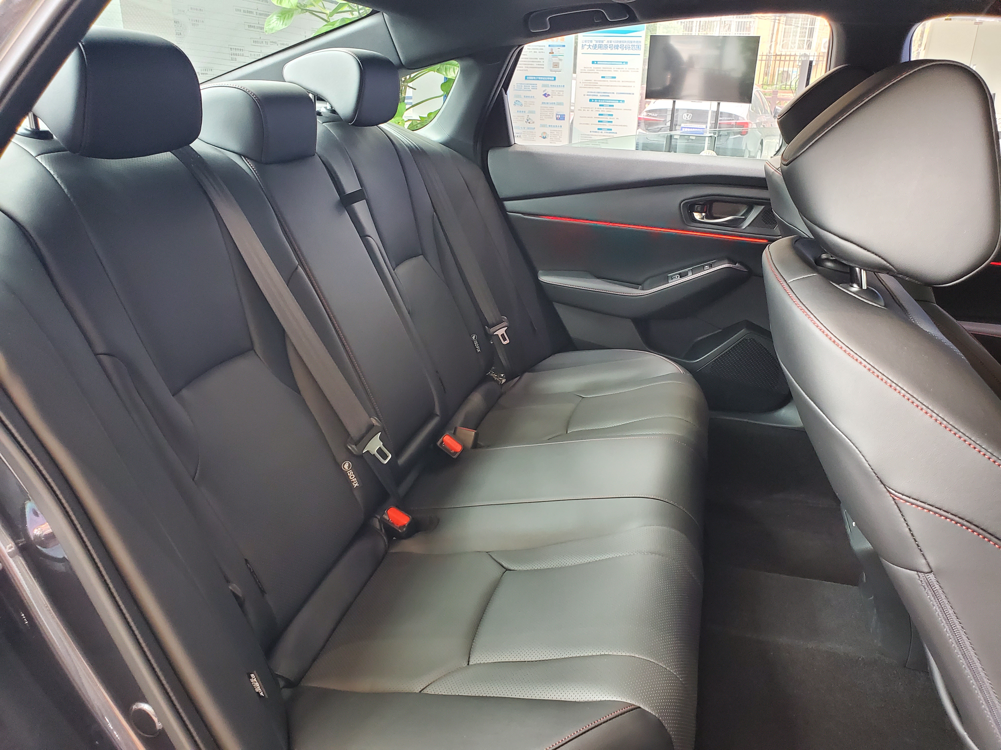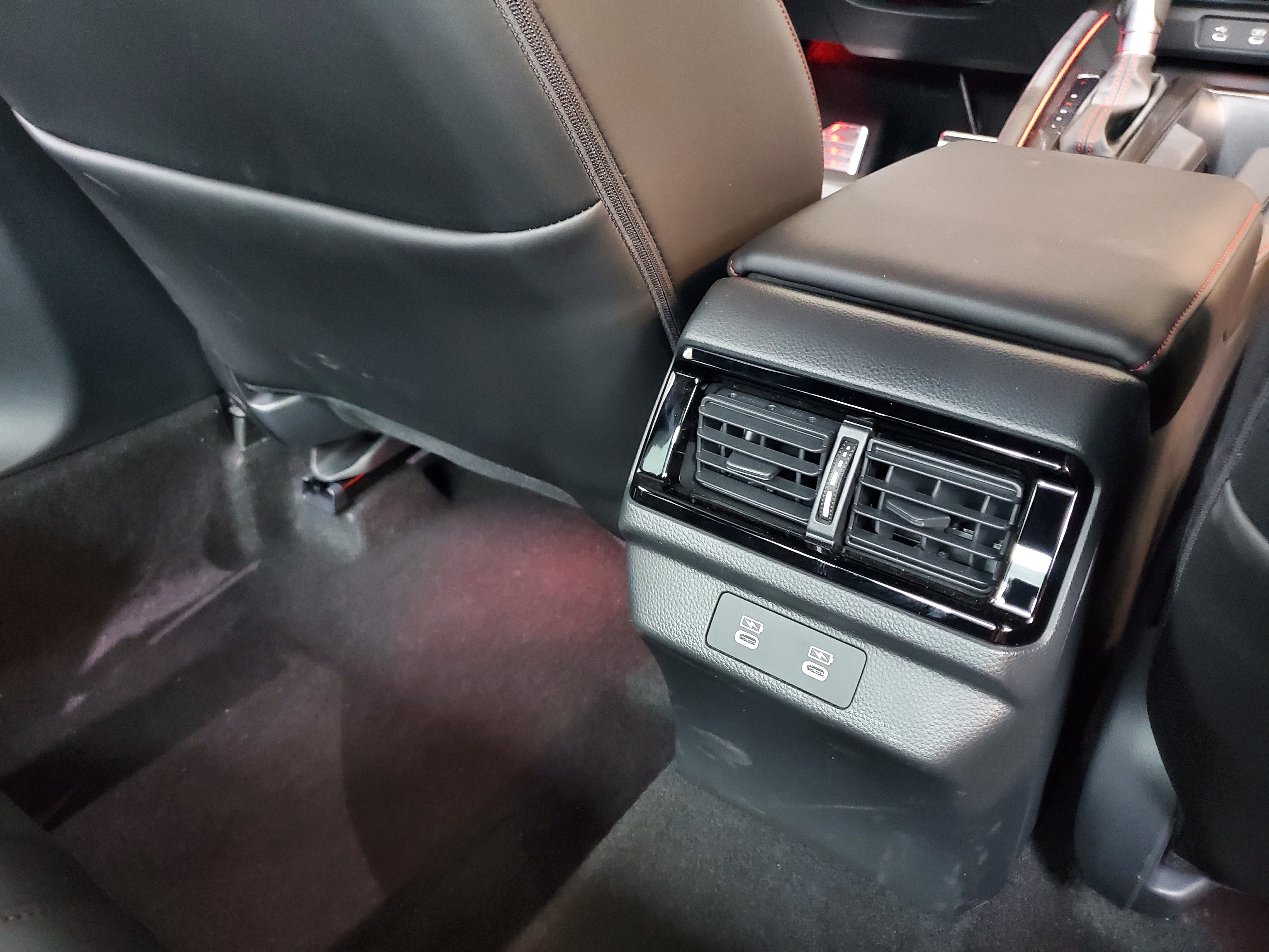 进入到后排,配有独立的空调出风口以及两个Type-c接口,乘坐体验方面,以身高175cm,体重110kg为例,前排调整至舒适的位置后,后排仍有半臂,约3拳的腿部空间,后排地板不是纯平设计,中间的凸起约11cm。