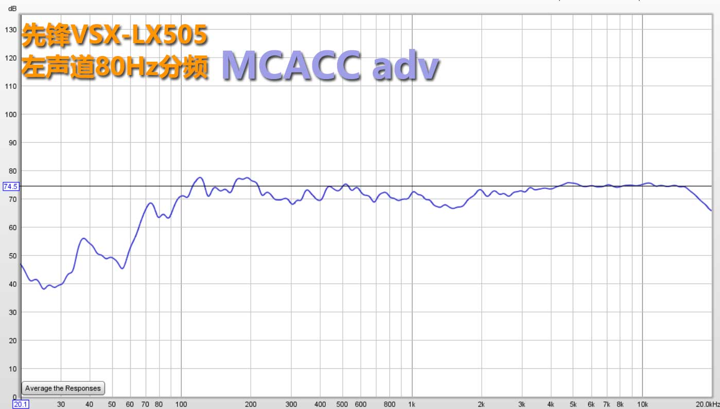 上面的频响是左声道80HZ分频后加上低音炮SUB信号的全频测试,实际上能看出MCACC ADV模式干预得比较克制。低音炮部份频响基本不干预,100Hz~200HZ有修正,然后高频部分有轻微修正。
