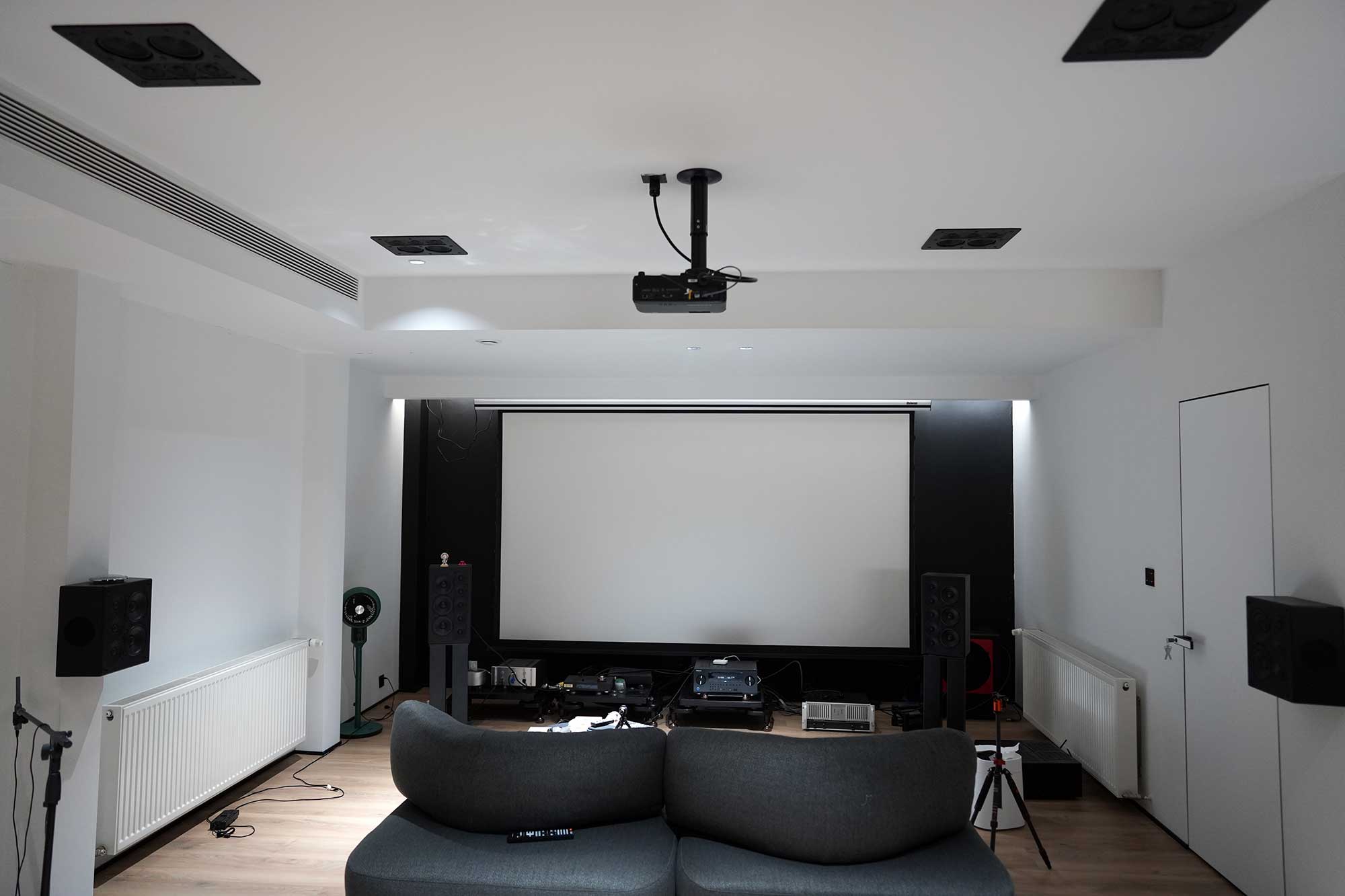 上面三张图,我们可以明显看出左右音箱和中置的不同,左右音箱离后墙有一米的距离。而中置是抵着后墙放于银幕后面,所以能看到他的低频部分和高频部分明显受到环境的影响。