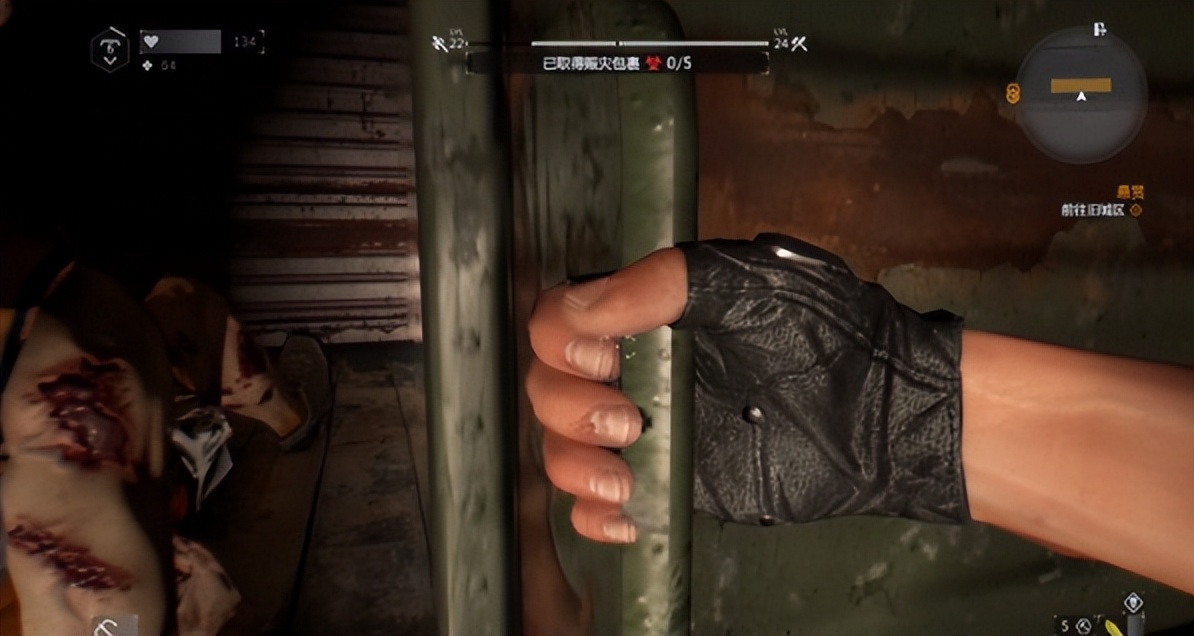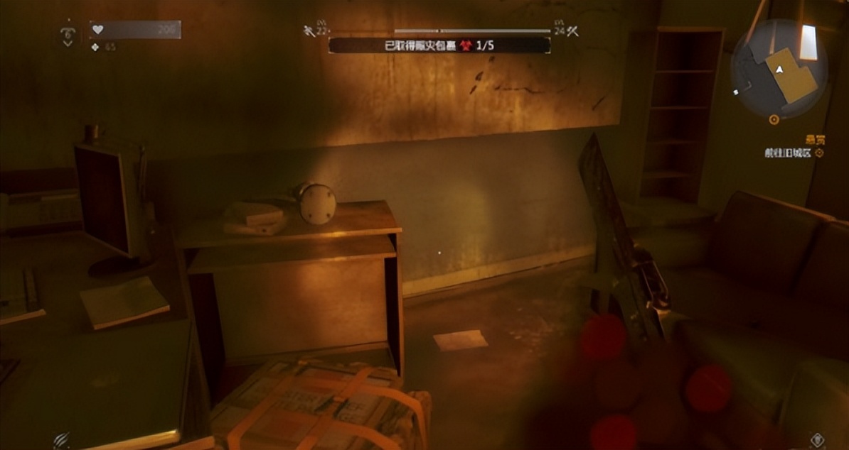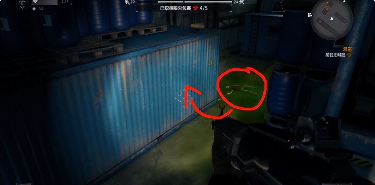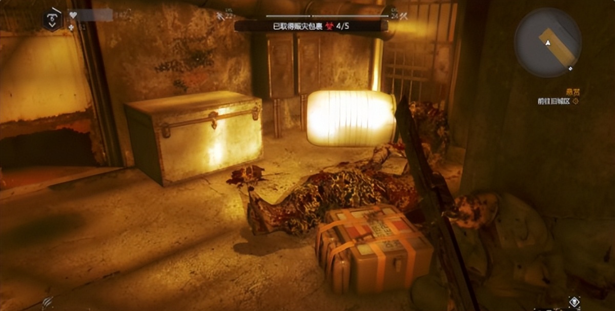 1.依旧从右侧蓝色集装箱攀爬而上,第一个赈灾包在对面集装箱顶部入口的舱内尽头,有一只普通感染者看守。