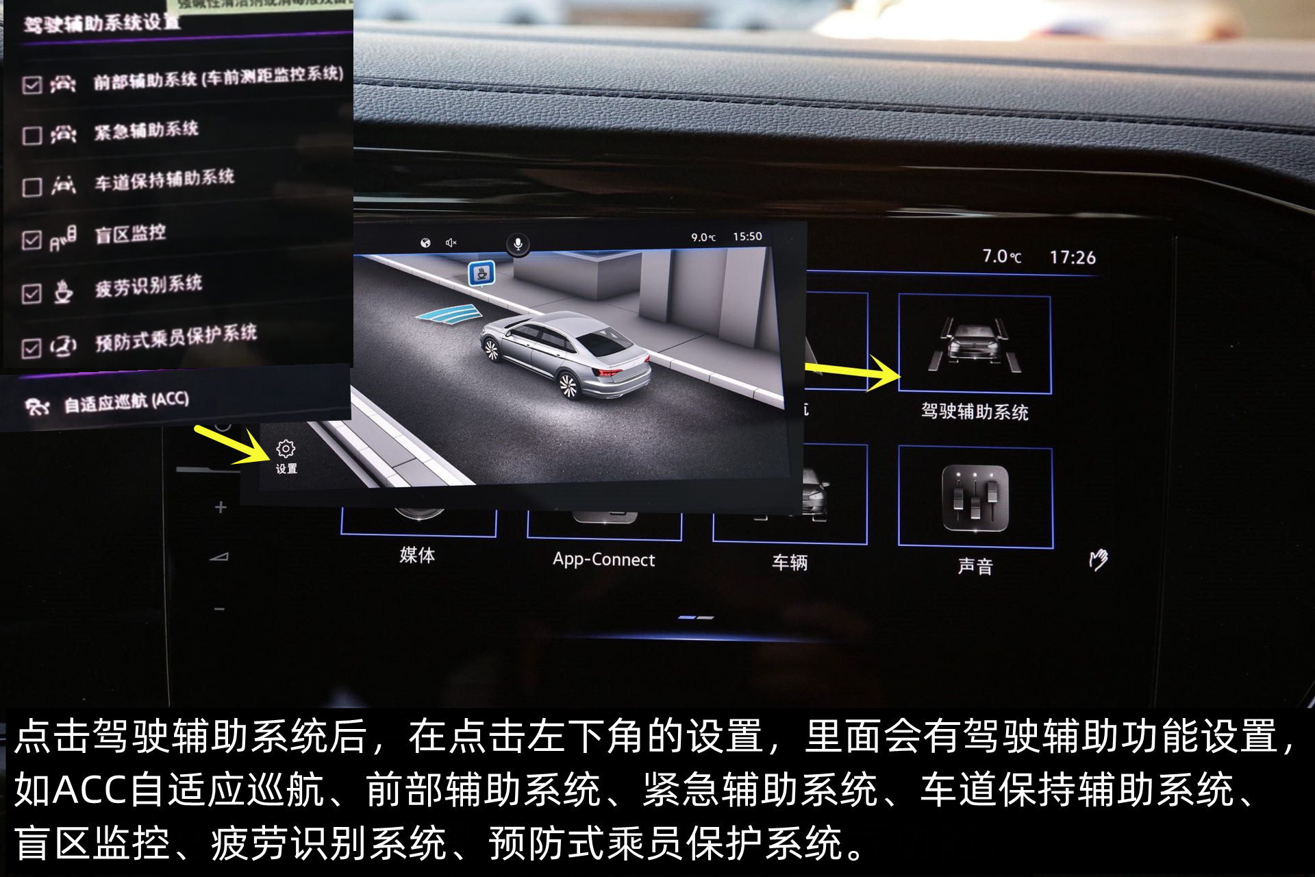 驾驶辅助系统里面有ACC自适应巡航系统设置,如前部辅助系统、紧急辅助系统、车道保持辅助系统、盲区监控、疲劳驾驶识别、预防式乘员保护系统等功能。(主要看车辆是否配置)