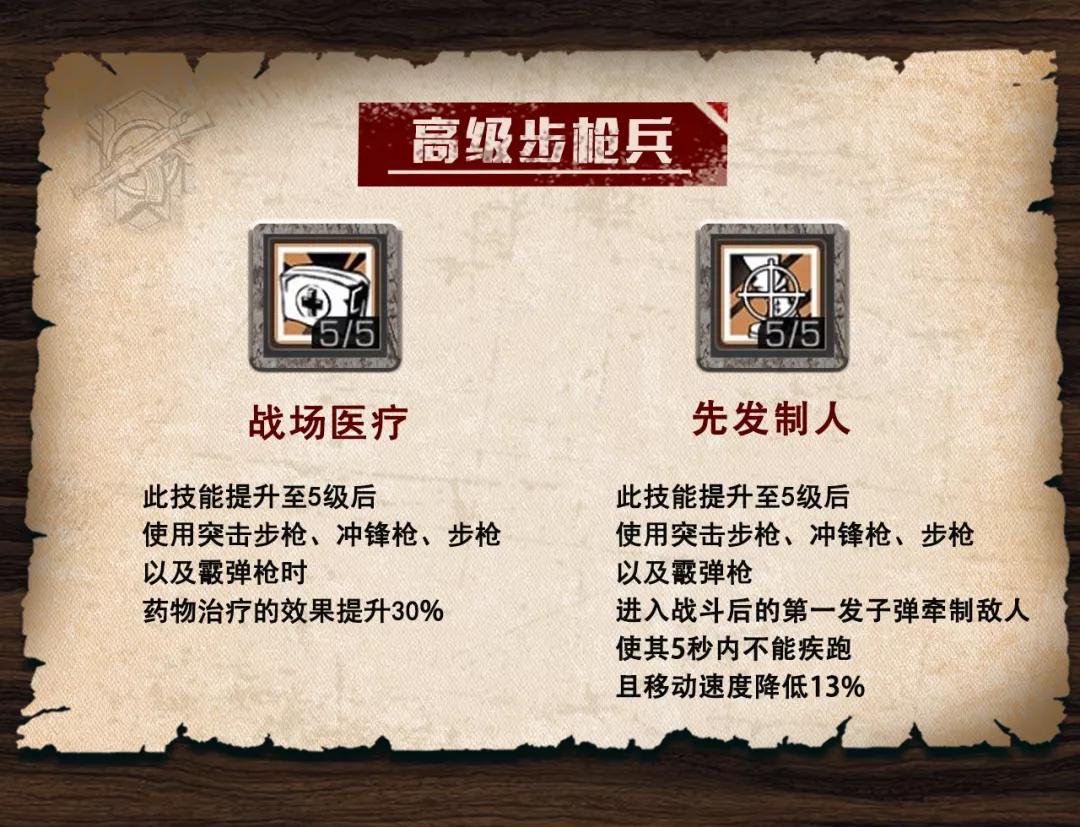 高级步枪兵:战场医疗按照百分比提升药物与食物的回血效果,但不包括医疗机和扩散器的治疗。