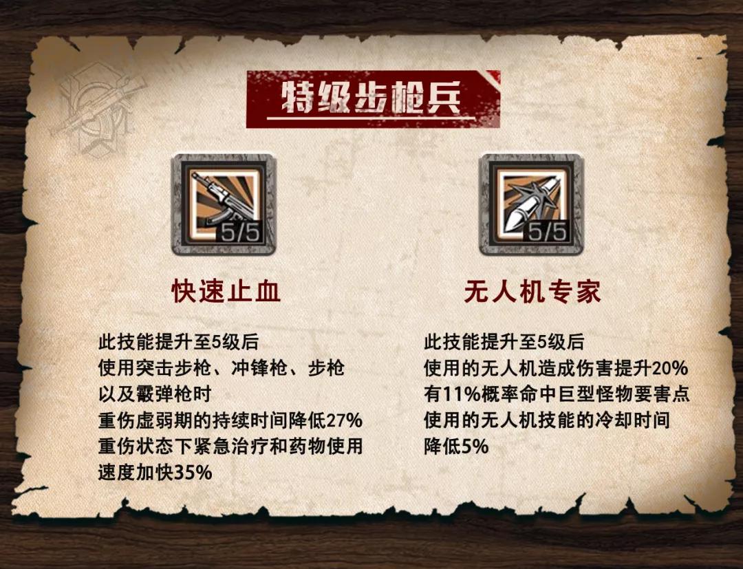 特级步枪兵:快速止血技能可以减少重伤虚弱时间,同时提升紧急治疗的速度便于幸存者快速脱险,无人机专家技能可以有效提升,无人机可造成的伤害,但需要及时给无人机配备当前版本的结构框架,并且机舱技能要尽量点满。